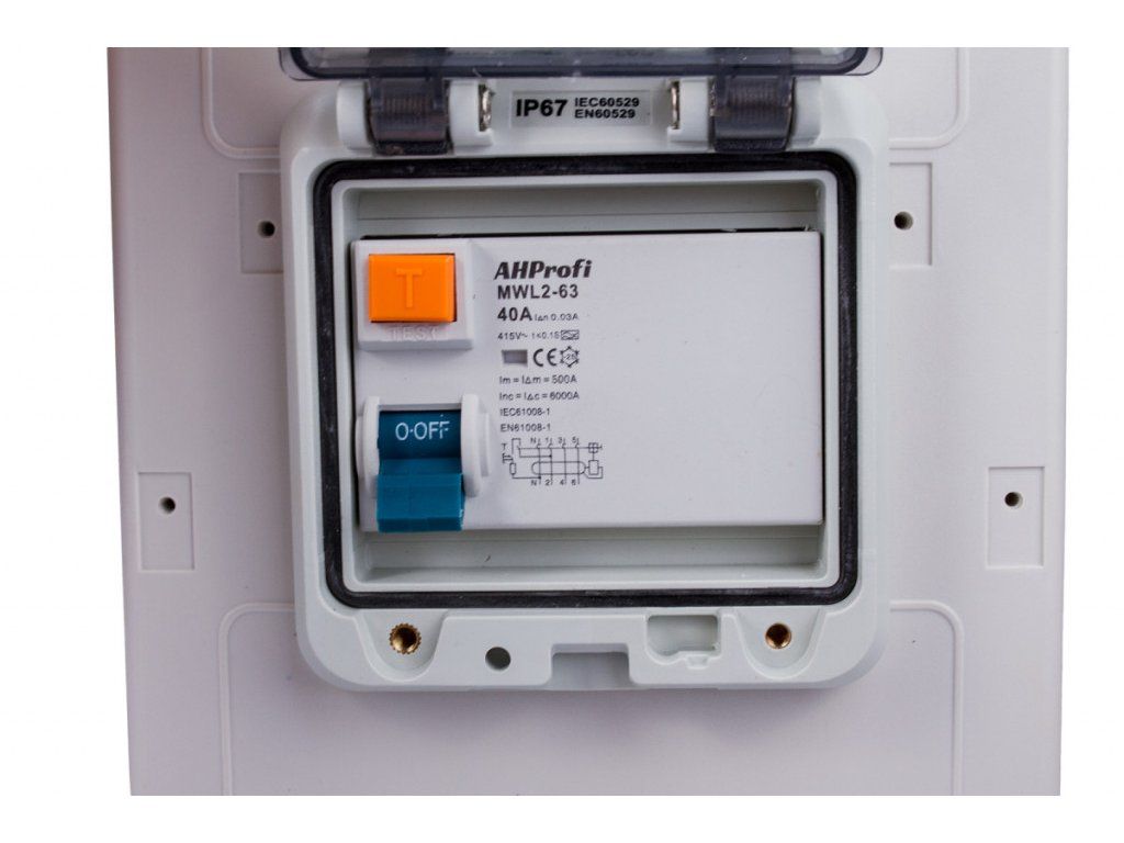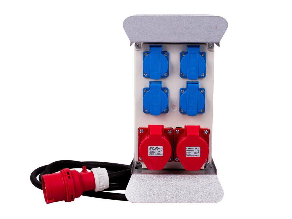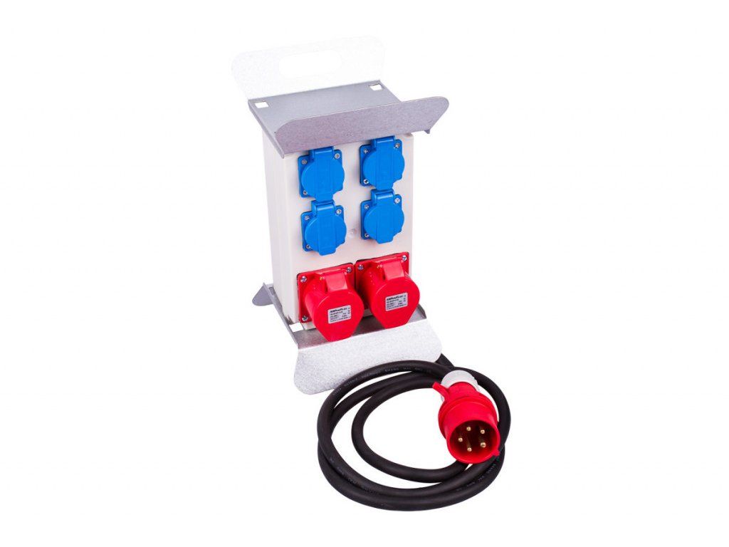 Rozvodná skříň má kabel se vstupem 16A 5P o délce 2,5 m. Dále má 6 výstupů, 4 zásuvky 16A a 2 zásuvky 16A 5P.