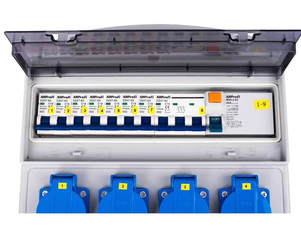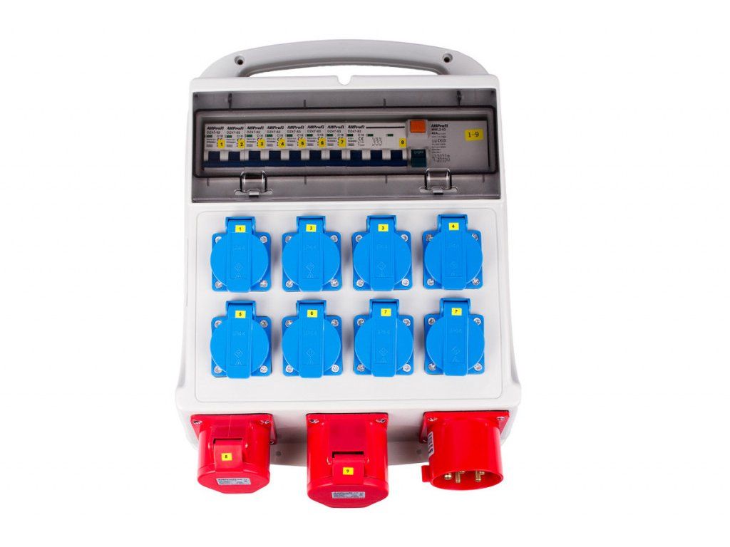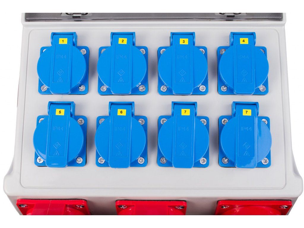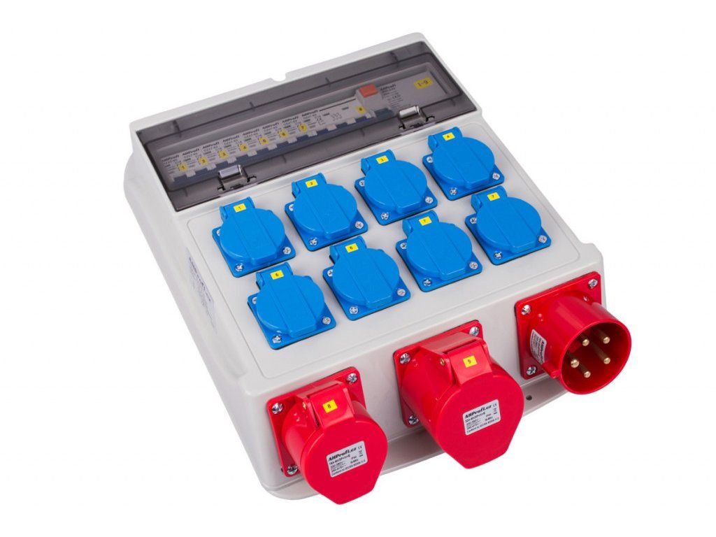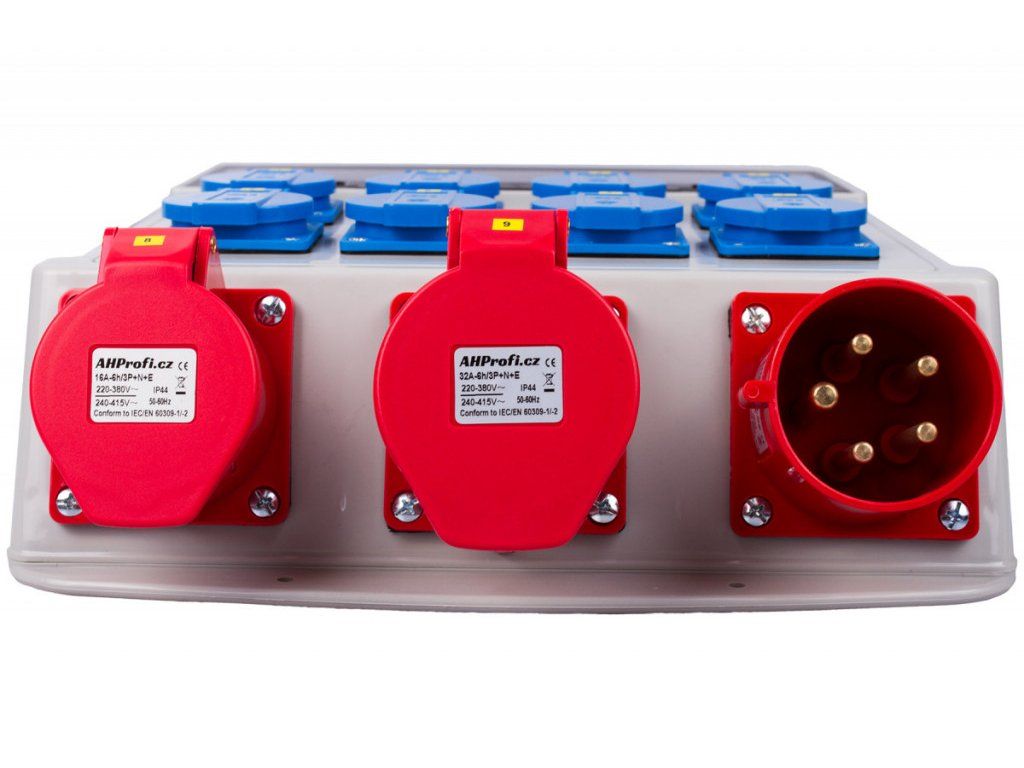 Vstup vidlice 32A 5P. Výstup 8x zásuvka 16A, 1x zásuvka 16A 5P, 1x zásuvka 32A 5P. Ochrana IP44.