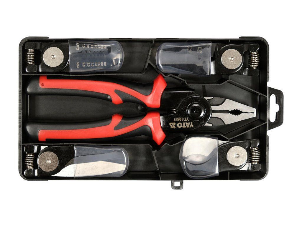 Pro řezání kabelů (rozsah řezání: 16 mm, materiál: uhlíková ocel), univerzální (rozsah řezání ocelového drátu: 3 mm, materiál: CrV60), pro řezání plechu (rozsah řezání ocelový plech 0,5 mm, nerez 0,3 mm, plasty 1,5 mm, materiál: 4Cr13), pro odizolování (rozsah: AWG 22-10, 0,6-2,6 mm, materiál: uhlíková ocel), pro krimpování konců drátů (rozsah: AWG 22-10, 1,5-6,0 mm), materiál: uhlíková ocel)