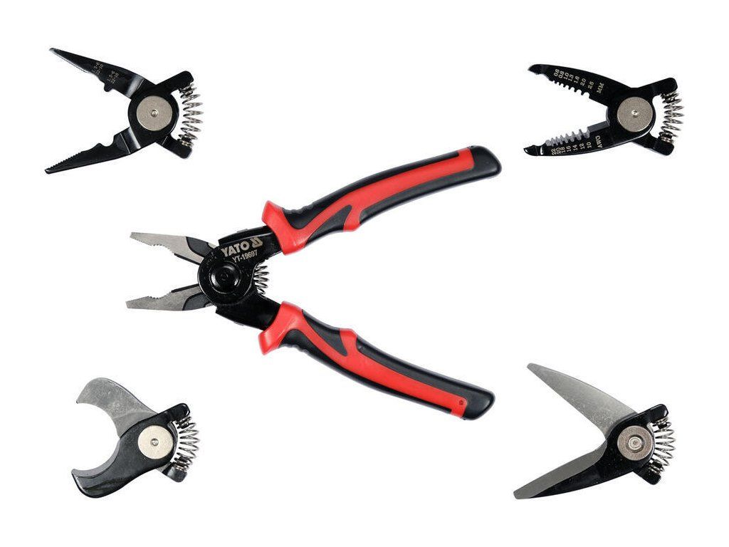 Multifunkční kleště pro elektrikáře. Díky výměnným hlavám lze z kleští udělat 5 různých nástrojů.