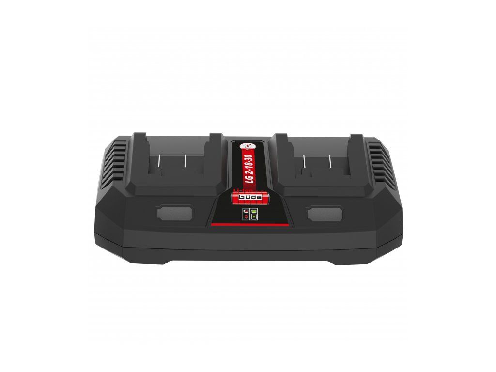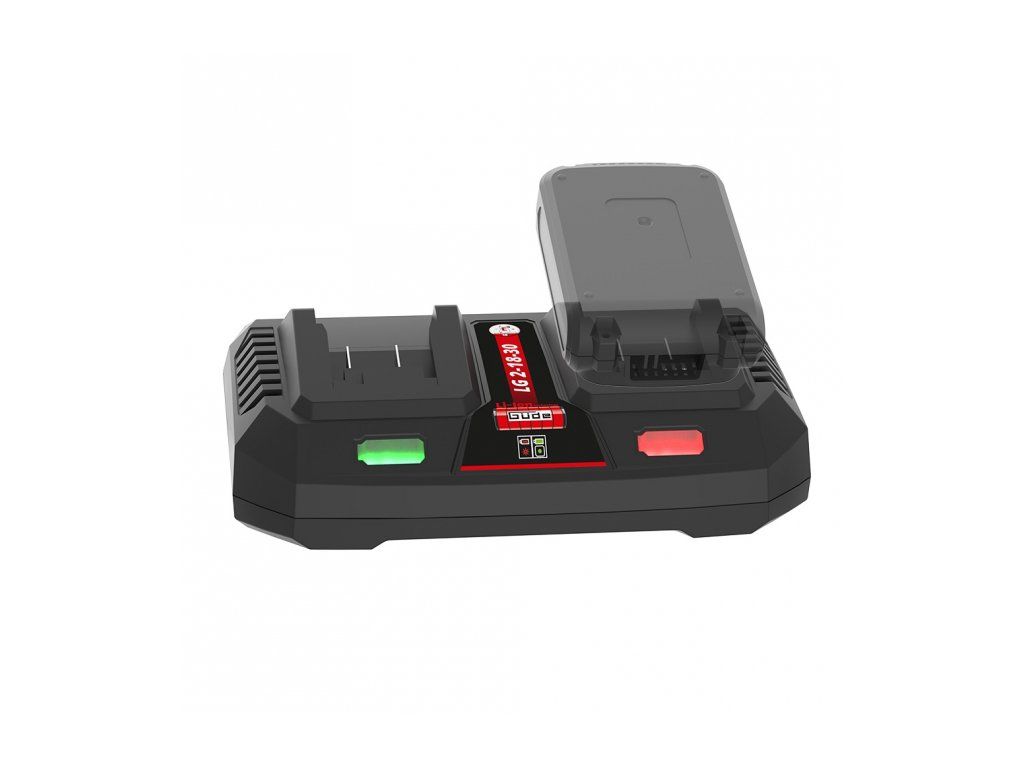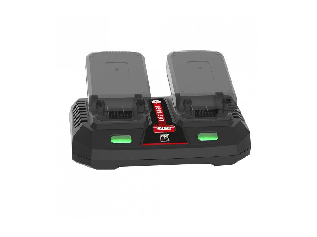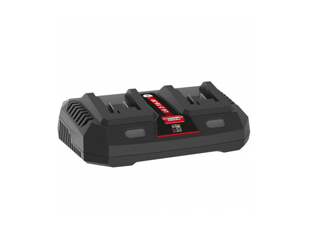 Nabíječka k dobíjení lithium-iontových akumulátorů, příkon 160 W, výstupní napětí 21,5 V, napájení 230 V. Dvě nabíjecí šachty, LED ukazatele stavu nabíjení, 2 m síťový kabel.