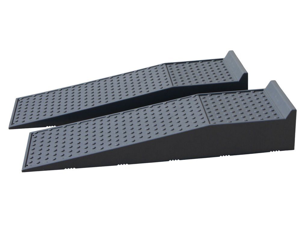 Rampy jsou opatřeny otvory pro připevnění k zemi pro lepší stabilitu a pro lepší přilnavost pneumatik jsou opatřeny drážkami na nájezdové ploše.