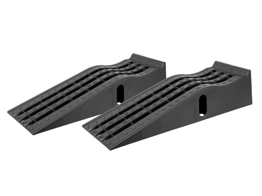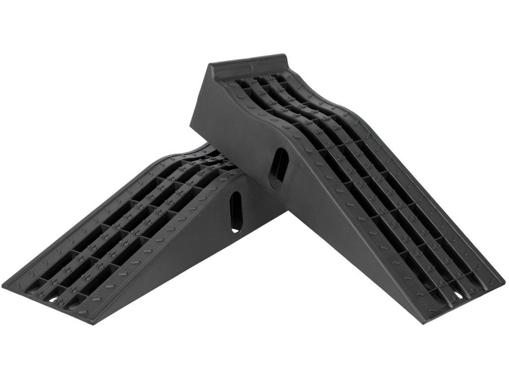 Vysoce stabilní plastové rampy pro bezpečné vyvýšení automobilu. Usnadňují přístup k podvozku při opravách a údržbě.