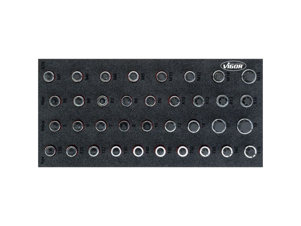 Pěnová vložka o rozměrech (š x h x v) 188 x 393 x 35 mm obsahuje celkem 36 ks profesionálních nástrčných hlavic s bity 1/2".