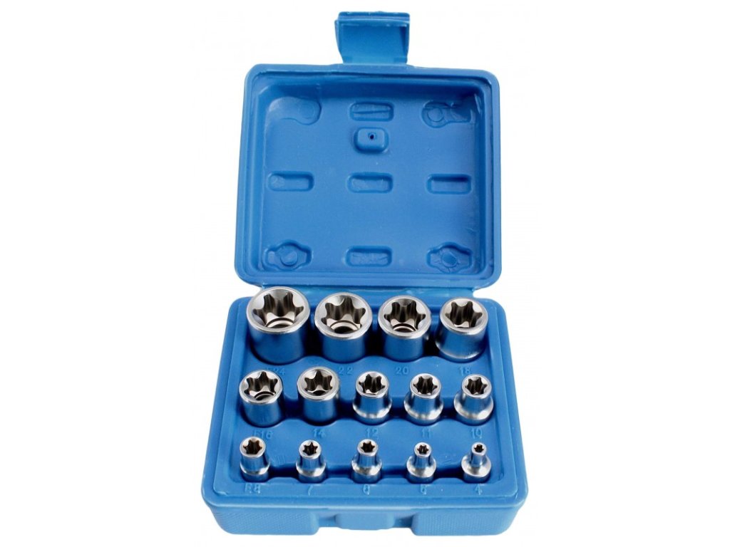 Sada 14 ks E-TORX nástrčných klíčů se čtyřhranem 1/4", 3/8'' a 1/2''.