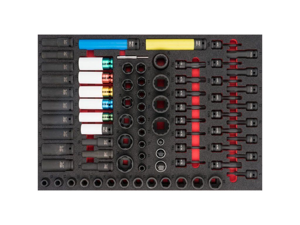80 kusů různých nástrčných klíčů v sadě pro rázové utahováky ve výplni do dílenského vozíku. Snadno čistitelná vložka z 2K měkké pěny, odolná vůči olejům a tukům. Rozměr 563 x 393 x 35 mm.
