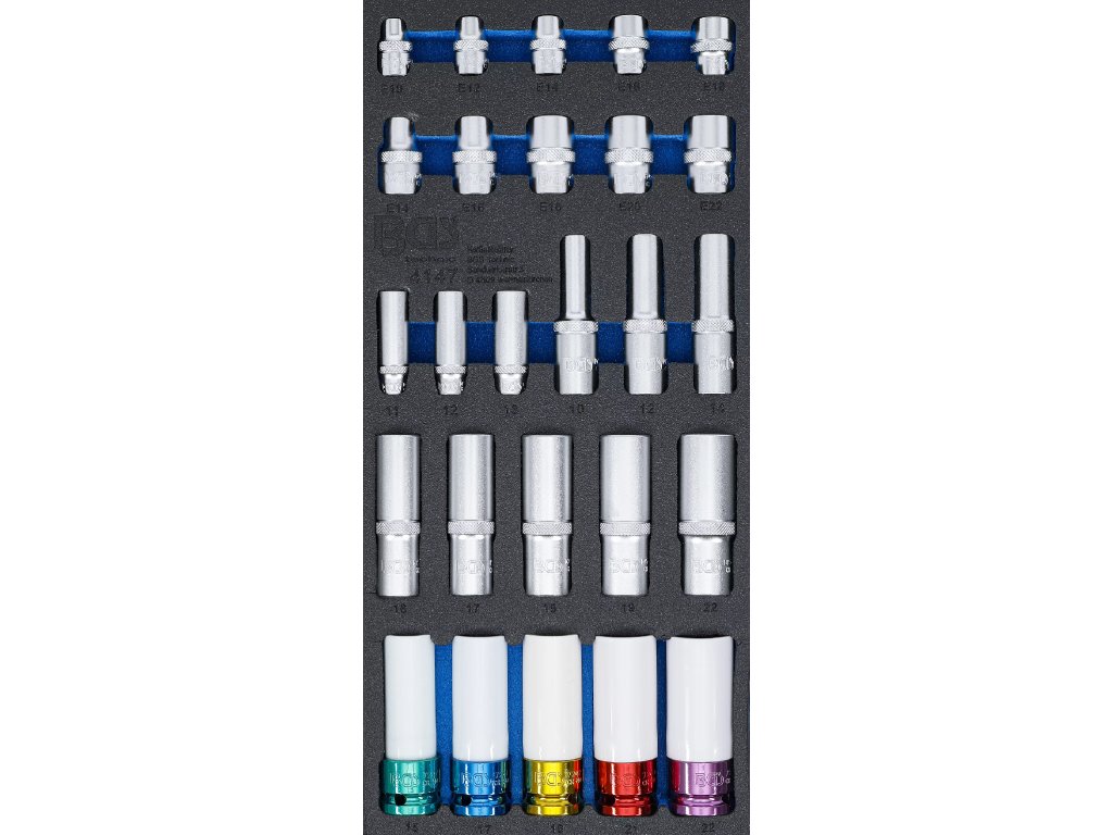 Nástrčné klíče v pěnové výplni, 1/2", 3/8", 1/4", 11 - 22 mm, E10 - E22, 26 ks - B4147