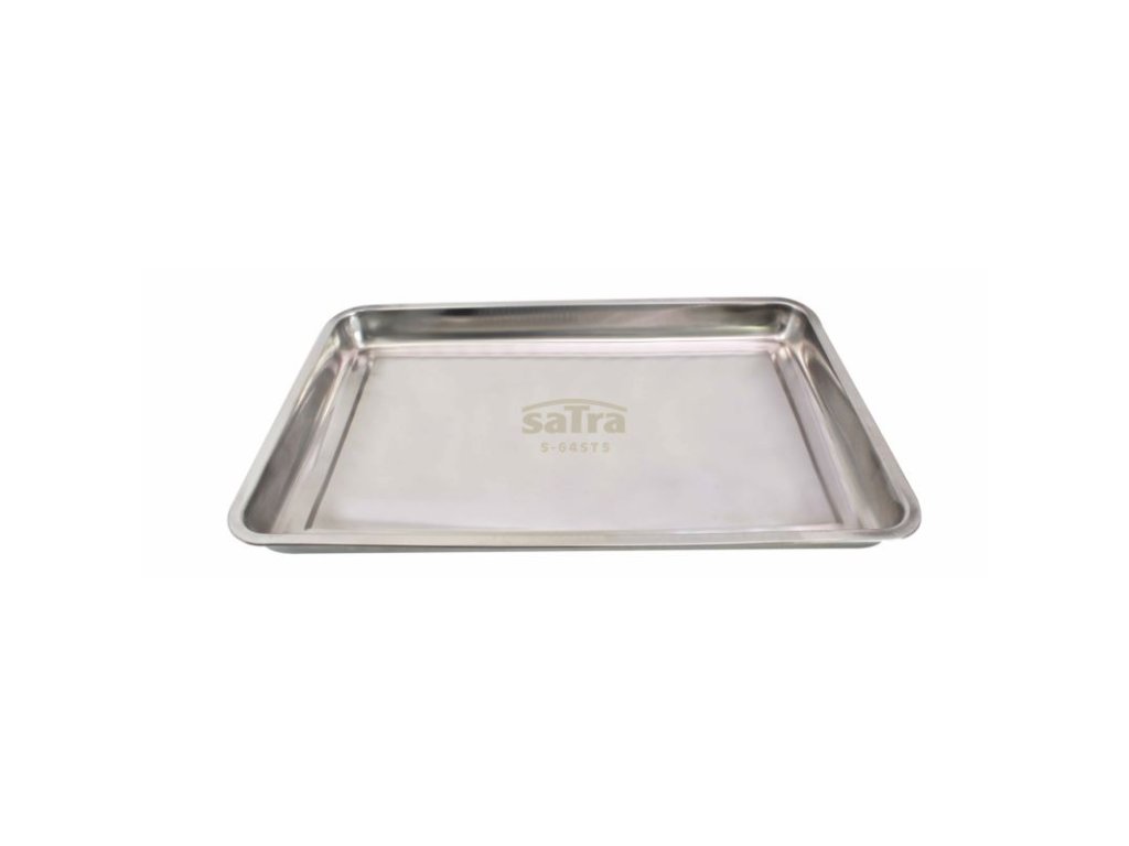 Nerezová nádoba na vypouštění oleje o objemu 11 l a o rozměrech 600 x 400 x 50 mm.