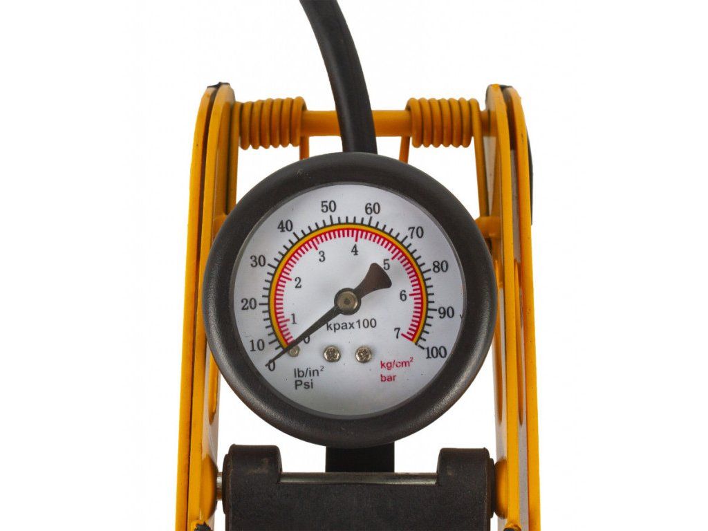 Kovová nožní hustilka s manometrem o rozměrech 95 x 90 x 290 mm.