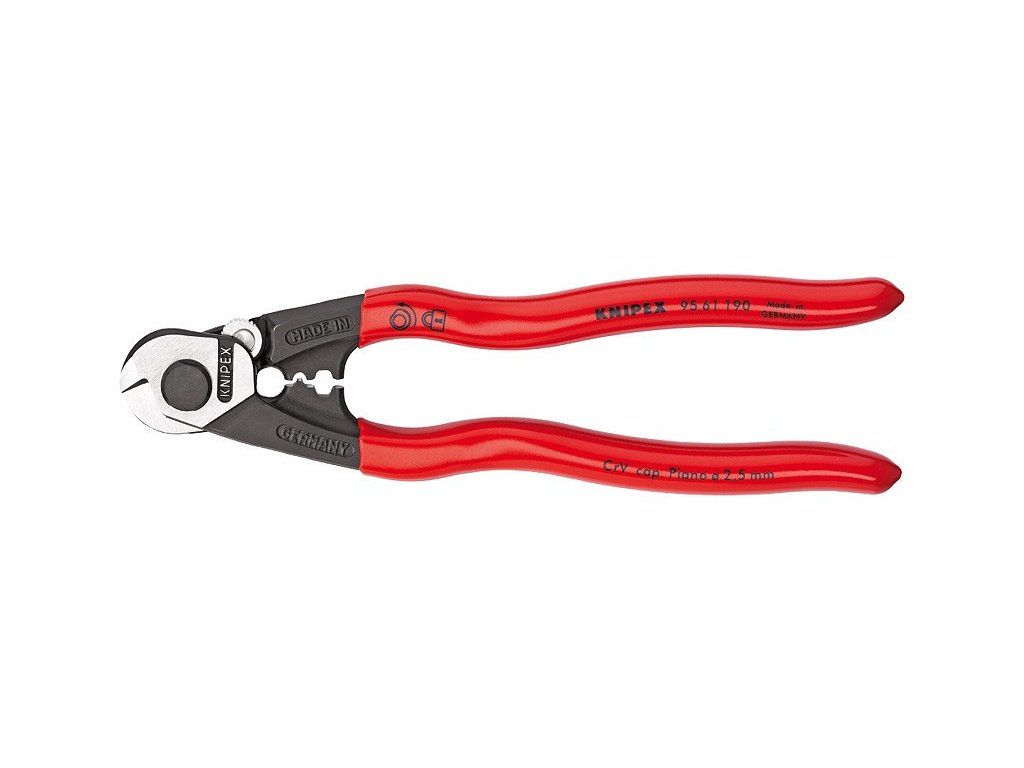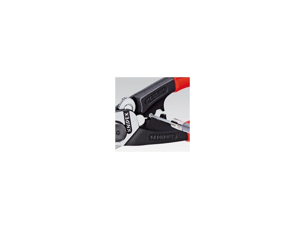S dvěma lisovacími profily pro koncovky krytek bovdenů a koncovky bovdenů. Komfortní práce díky ergonomické, štíhlé konstrukci a uvnitř umístěné rozvírací pružině. šroubový kloub pro přesné vedení nože, nastavitelný. Silný převod umožňuje vyvinou při práci větší sílu. Tvrdost břitů cca 64 HRC. Chromvanadová vysoce výkonná ocel, kovaná, kalená v oleji. S otevírací pružinou a blokovací západkou. Vhodné pro středně tvrdá drátěná lanka do ? 6 mm např. bowdeny, ale i pro kabely a ocelovou kulatinu. Břity doplňkově induktivně tvrzené. Zvláštní geometrie břitu zabraňuje rozpletení drátěného lanka.