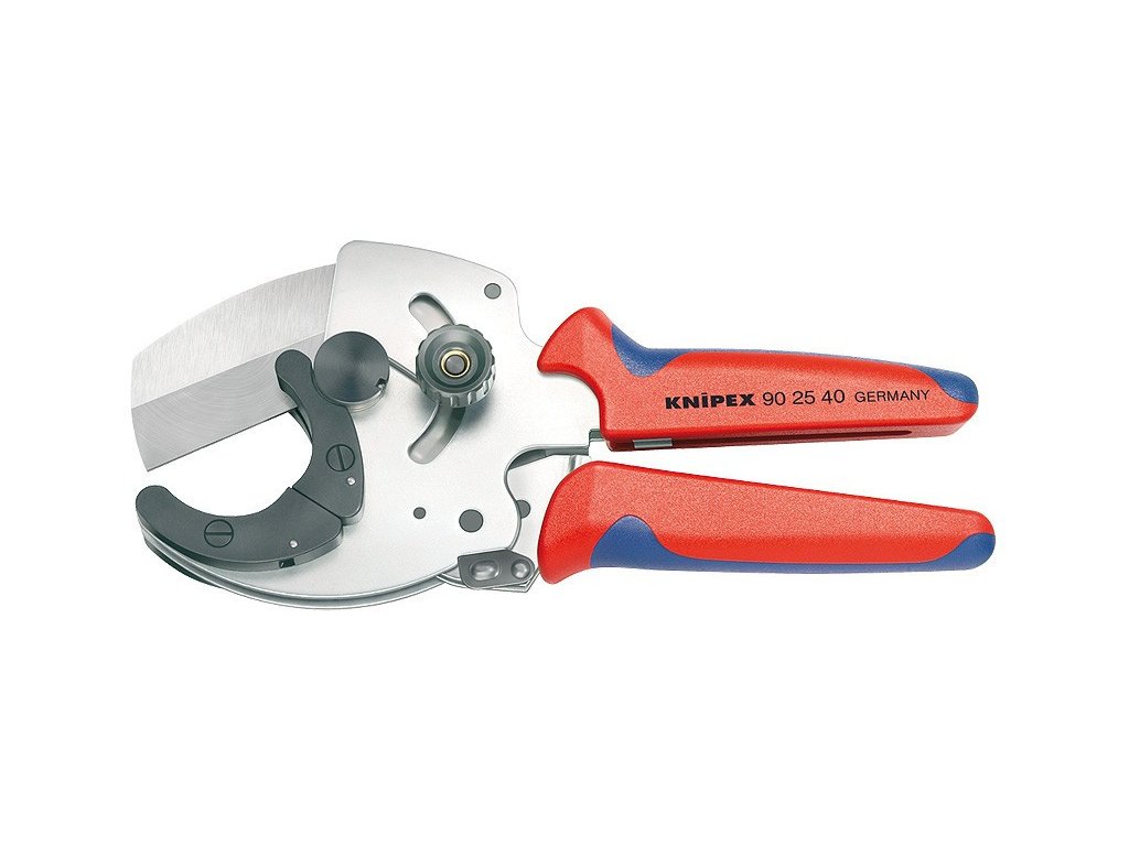 Ke střihání silnostěnných plastových a vícevrstvých trubek 26 - 40 mm. řežou trubky na principu rohatky se západkou pomocí více zdvihů. S pohyblivými opěrnými čelistmi ke správné fixaci trubky pro pravoúhlý řez.