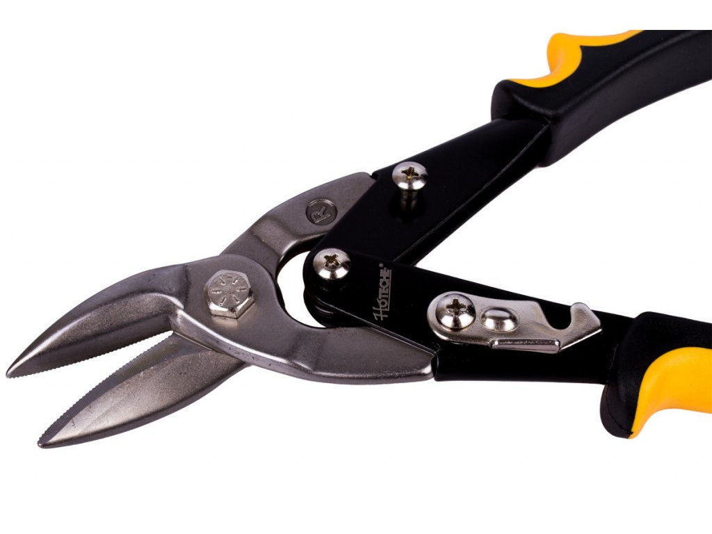 Nůžky na plech levé jsou vyrobené z kované oceli, což zajišťuje trvanlivost a sílu. Rukojeť je vyrobena z PVC a disponuje protiskluzovou rukojetí, a proto se s nimi dobře manipuluje. Indukční kalení zajišťuje větší životnost. Tyto nůžky mají zubaté řezání nože, které jsou vhodné na tvrdé materiály.