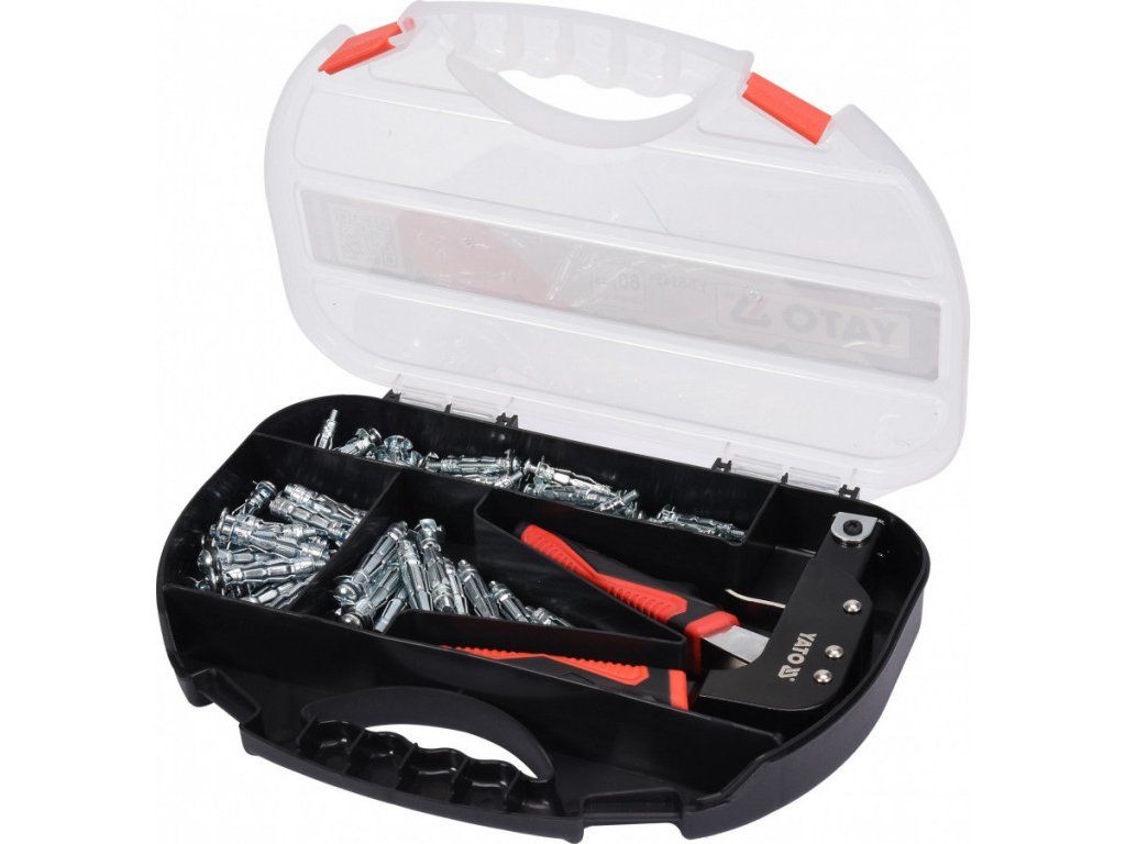 Nýtovací kleště s hmoždinkami a šrouby, 60 ks uloženo v plastovém kufříku, vhodné k uchycení lehkých předmětů do sádrokartonových desek.
