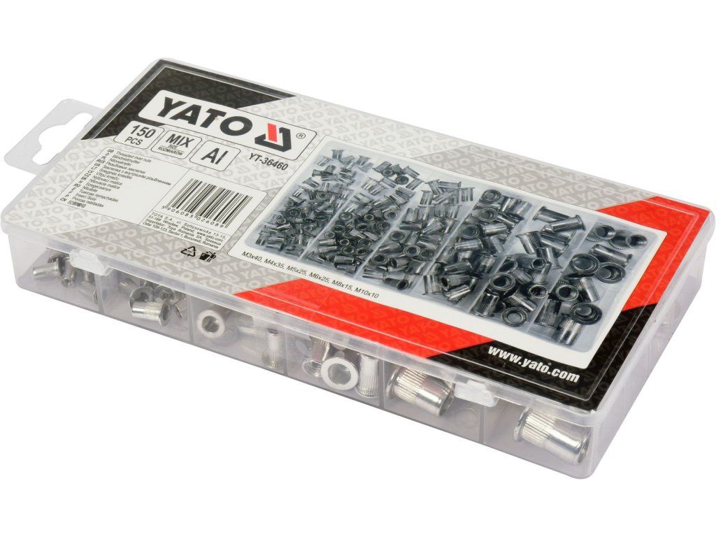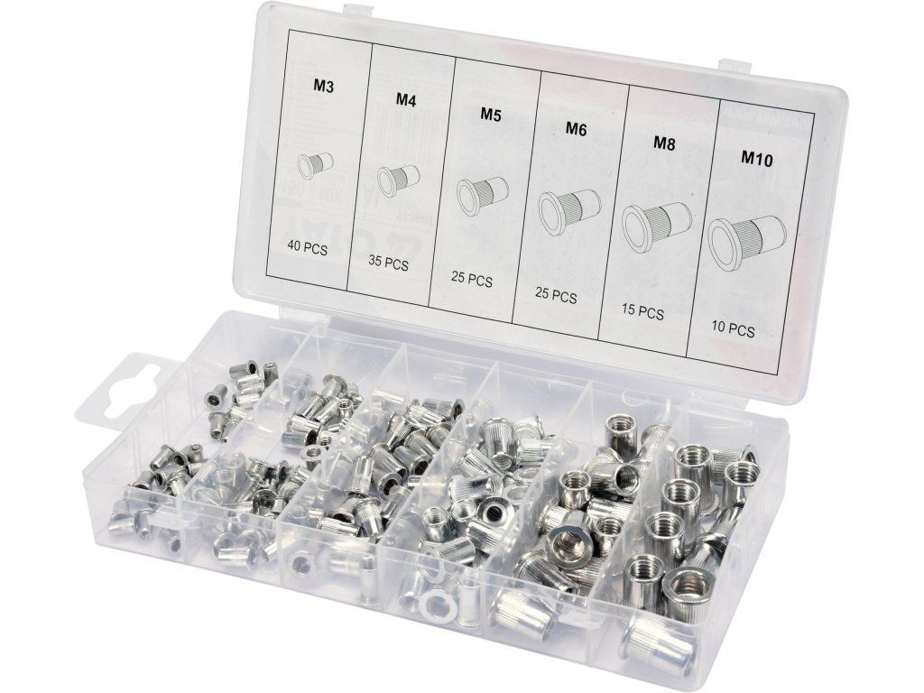 Obsahuje matice M3, M4, M5, M6, M8 a M10, vroubkovaný límec.
