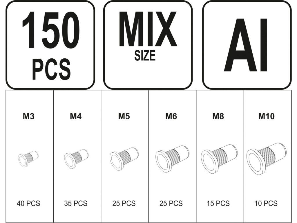 Sada hliníkových nýtovacích matic s metrickým závitem M3 - M10.