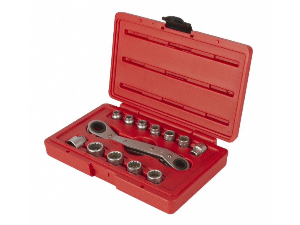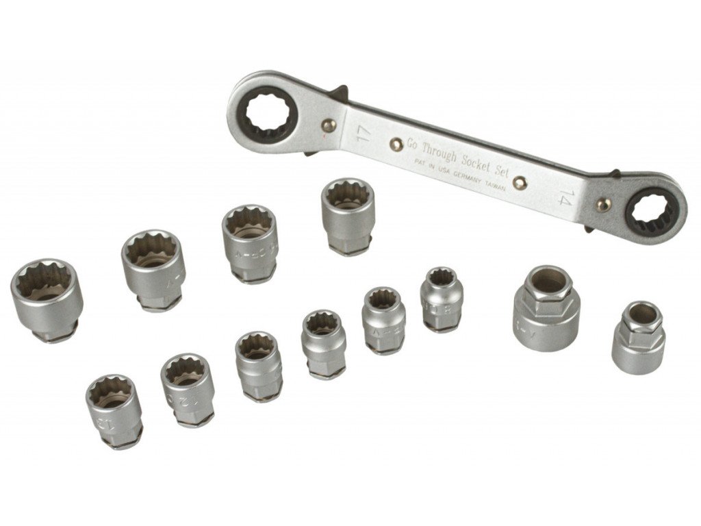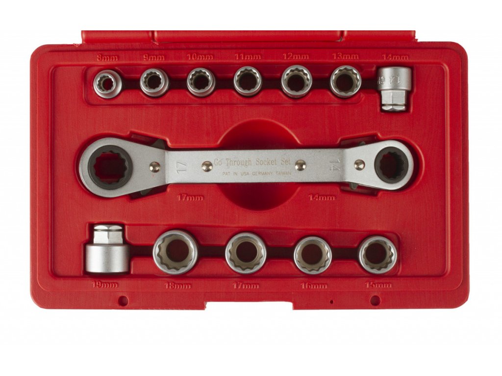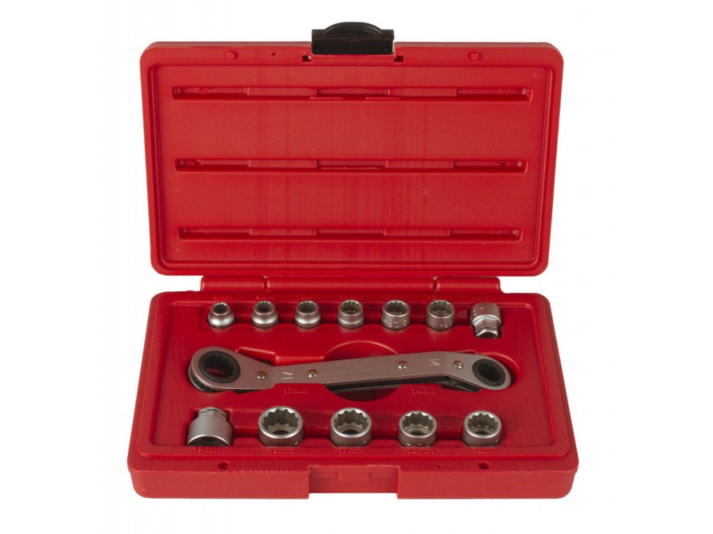 V sadě naleznete ráčnový oboustranný klíč o základních velikostech 14 a 17 mm a dále 12 ks nástrčných adaptérů.