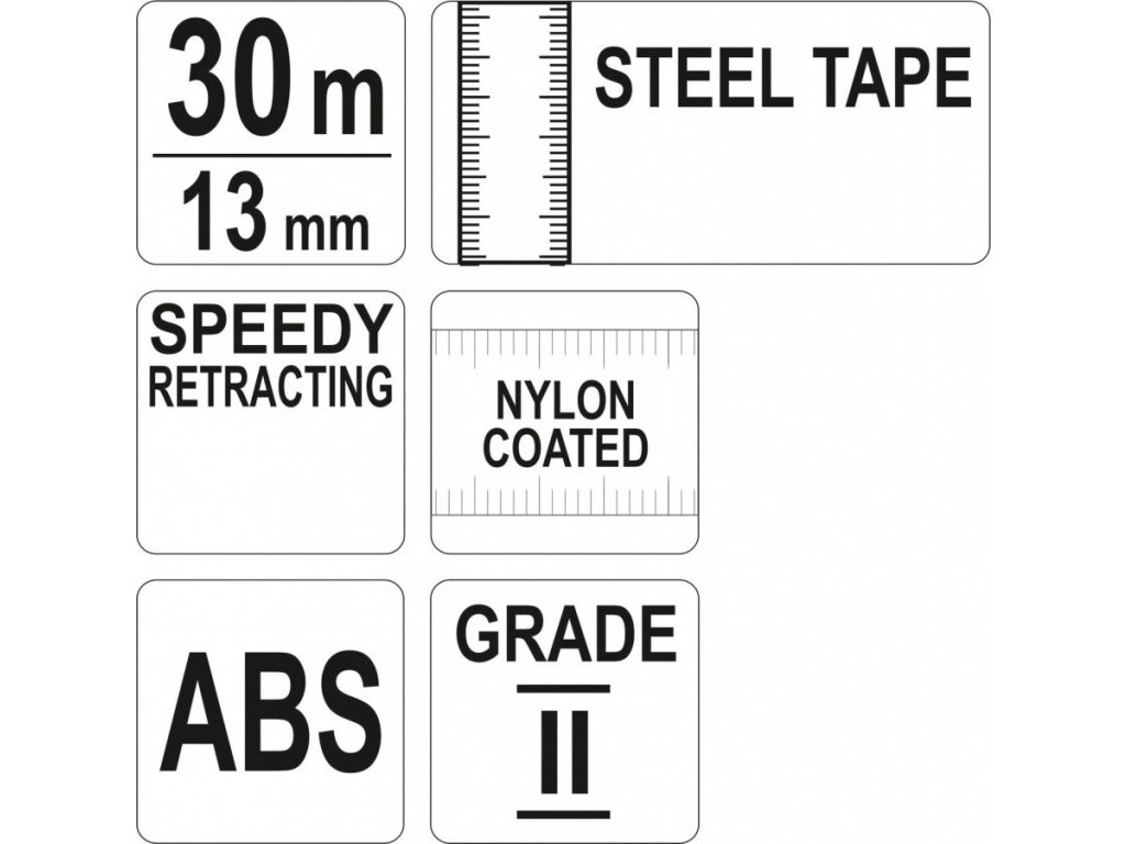 Měřící pásmo o délce 30 m s šířkou 13 mm. Konstrukce z odolného ABS plastu, pásmo z ocele.