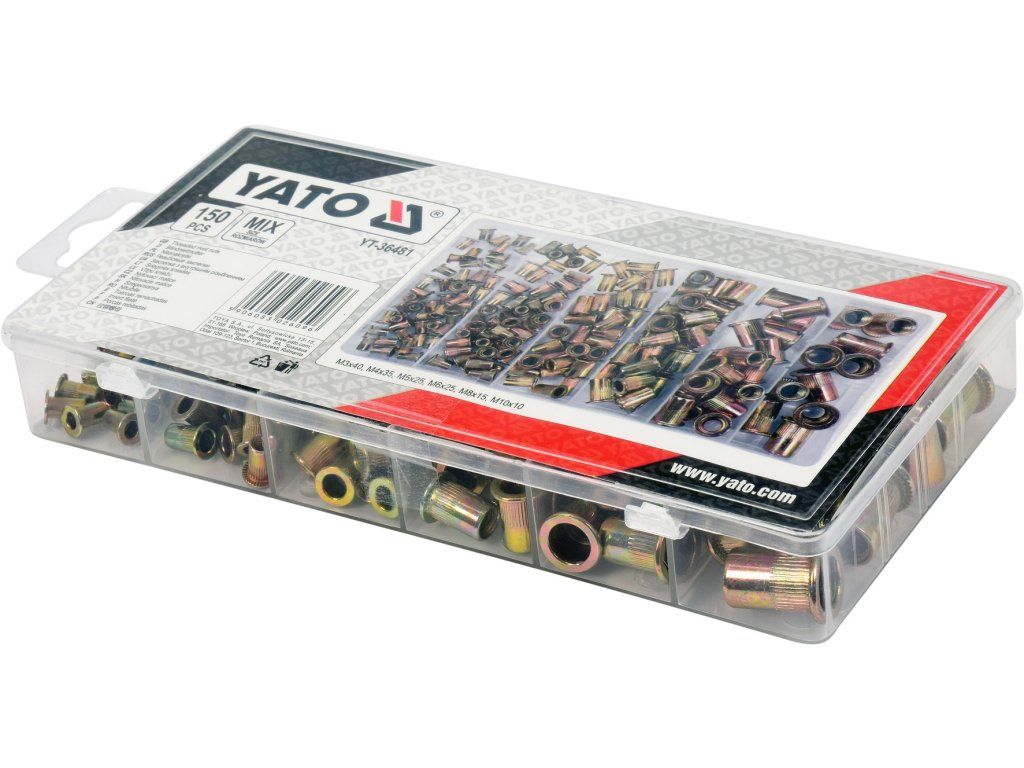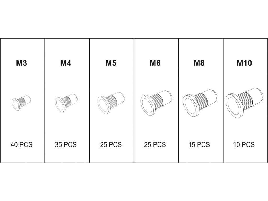 Sada obsahuje ocelové matice o velikostech M3, M4, M5, M6, M8 a M10.