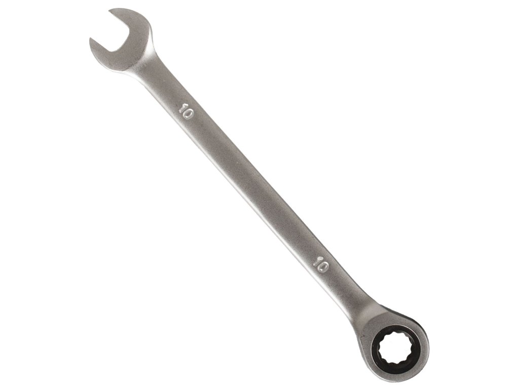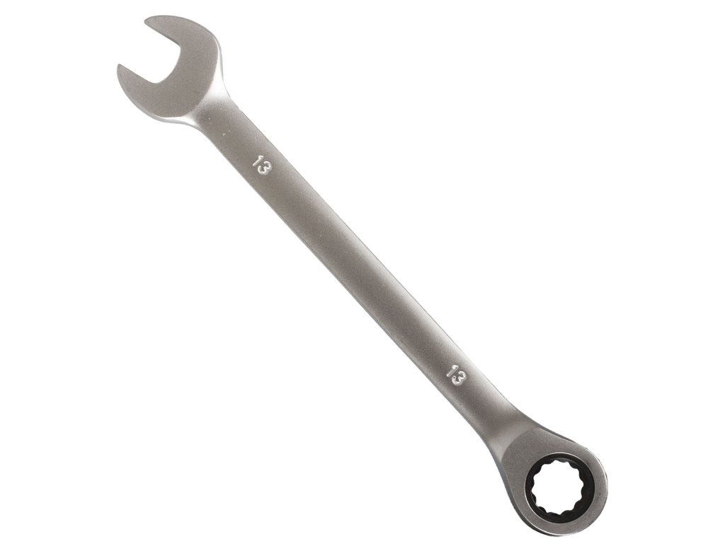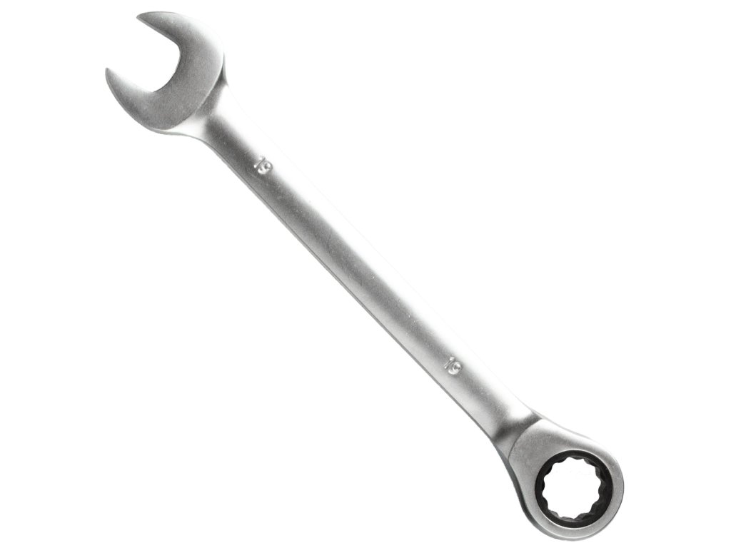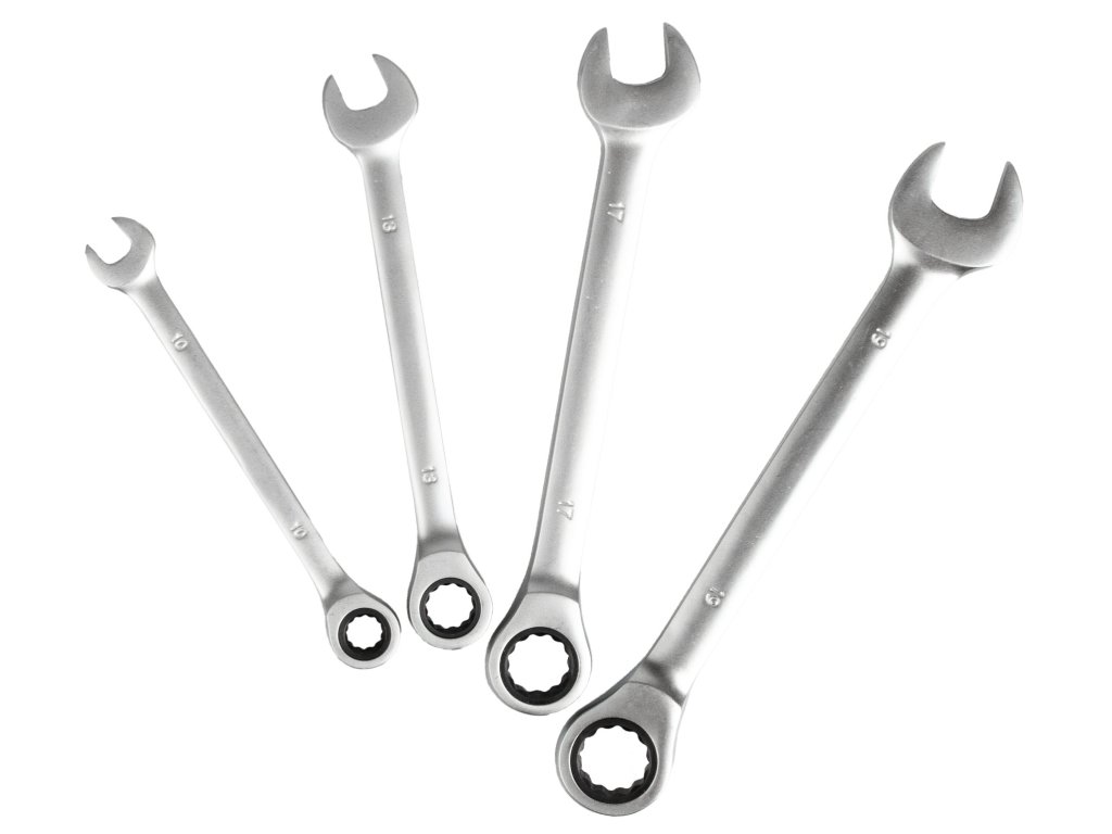 Ráčnové očkoploché klíče o rozměrech 10, 13, 17 a 19 mm. Na jedné straně klasický stranový klíč, na straně druhé očkový klíč s dvanáctihranným profilem vybaveným ráčnou.