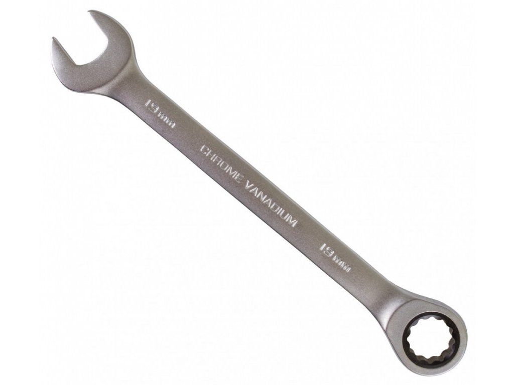 Ráčnový očkoplochý klíč od značky Hoteche o rozměru 19 mm je na jedné straně klasický stranový klíč, na straně druhé očkový klíč s dvanáctihranným profilem vybaveným ráčnou s jemným dělením 72 zubů. Celková délka klíče je 240 mm.