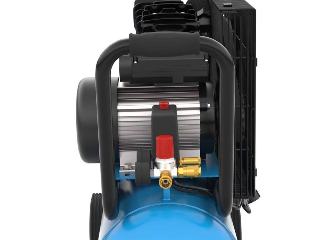 Vybavení: tlakový spínač, 2 manometry (tlak v nádobě / pracovní tlak), 2 výstupy stlačeného vzduchu, redukční ventil, pojistný přetlakový ventil, zpětný ventil, zátka pro vypouštění kondenzátu, integrovaný vzduchový filtr, ochrana proti přetížení, transportní rukojeť.