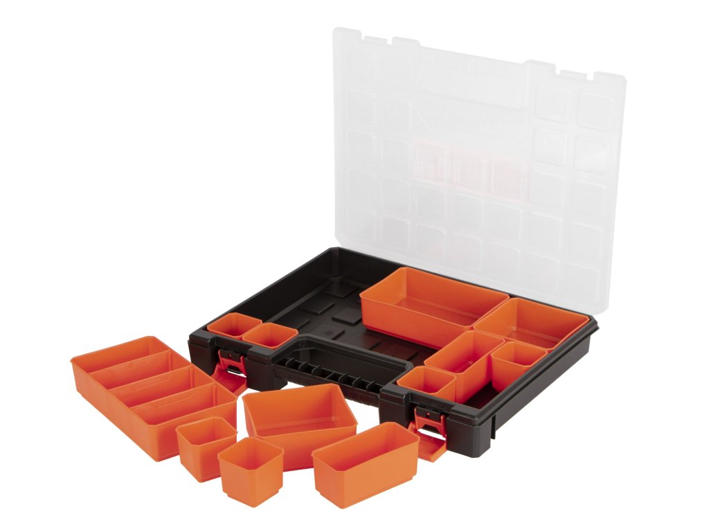 Organizér je vhodný na uskladnění drobného materiálu, jako jsou například šroubky, matice a jiný drobný materiál.
