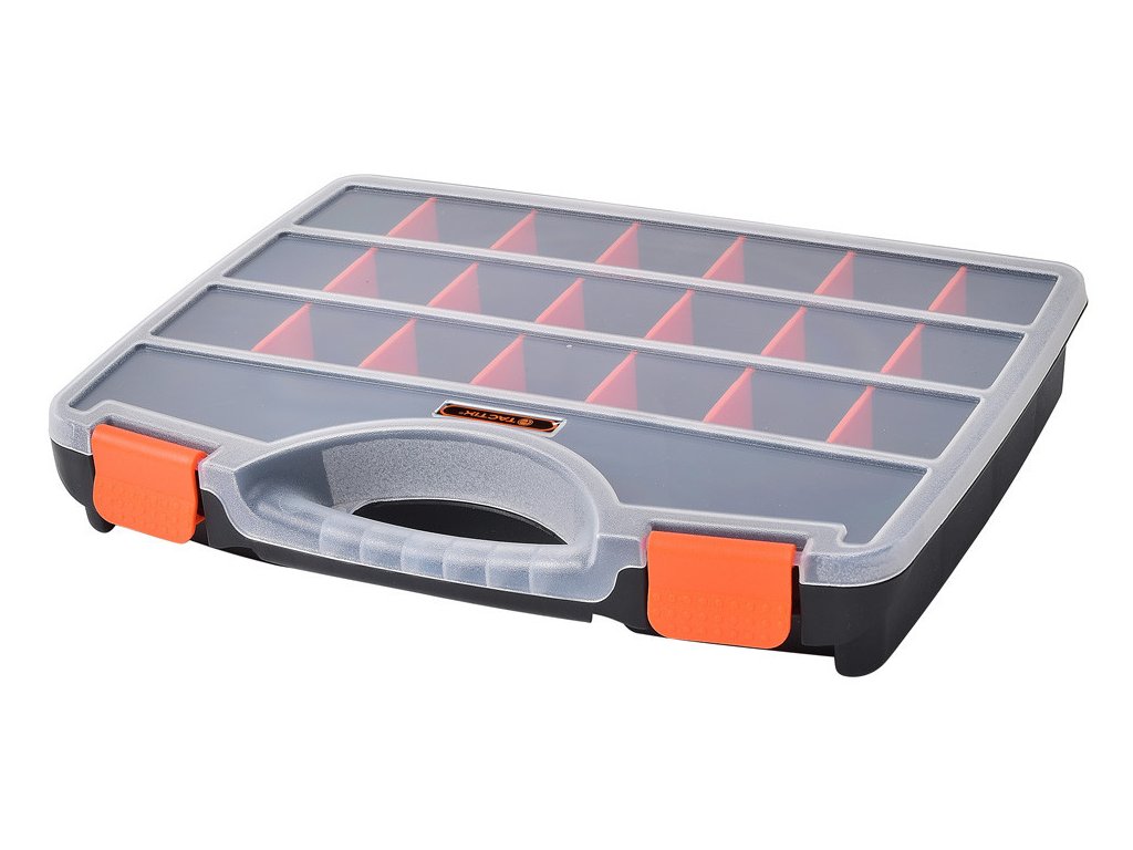 Rozměry: 310 x 240 x 50 mm, vyrobeno z plastu, 23 přihrádek, Tactix.