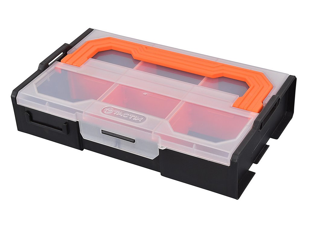 Plastový organizér na šroubky a drobný materiál, 6 variabilních přihrádek. Rozměr: 260 x 168 x 67 mm.