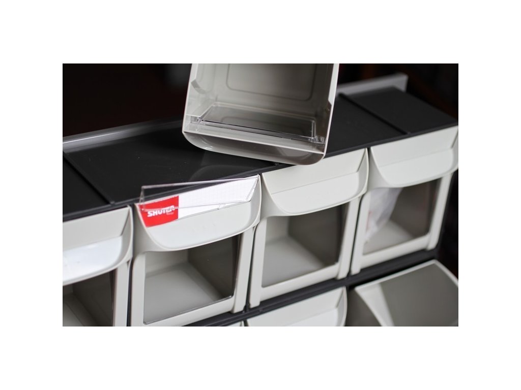 Konstrukce obsahuje drážky na všech stranách pro možnost spojování více organizérů dohromady – horizontálně i vertikálně – a vytvoření individuální úložné sestavy.
