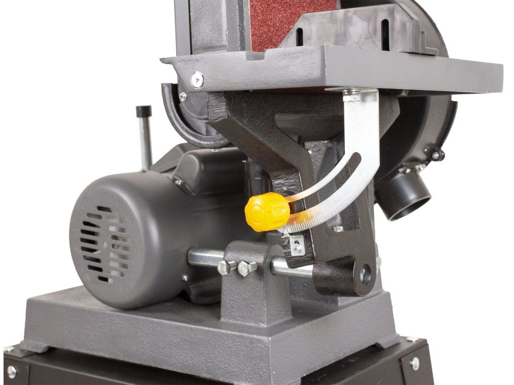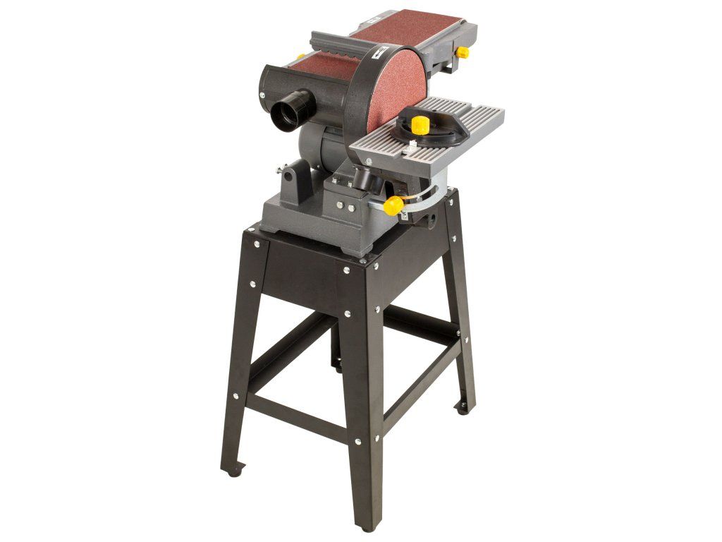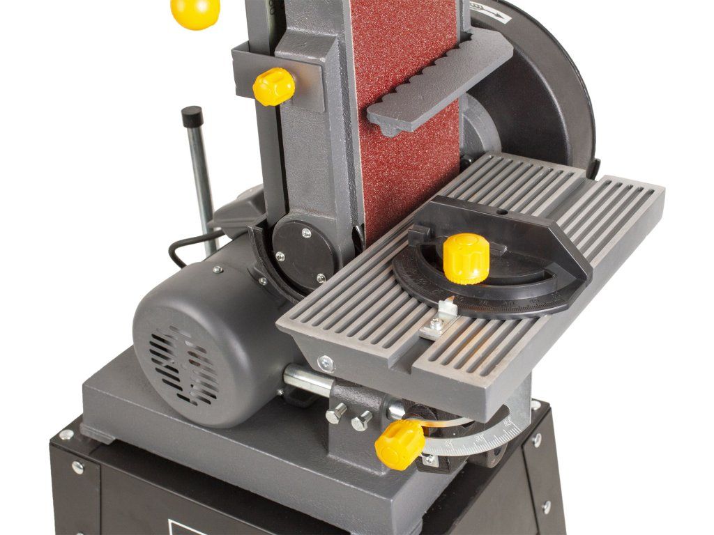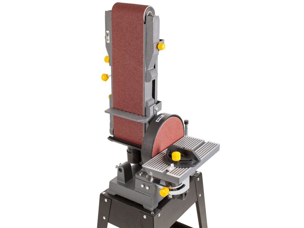 Pro pohodlnější a přesnější obrábění slouží polohovatelný podpěrný stolek, který lze umístit k brusnému pásu i k čelnímu kotouči.