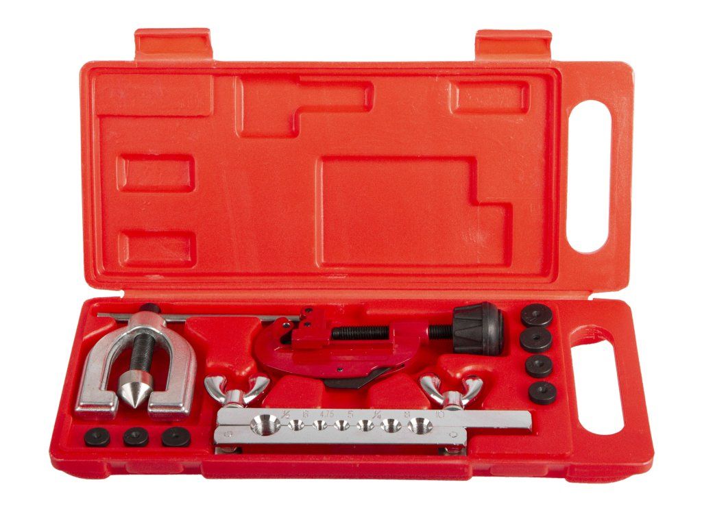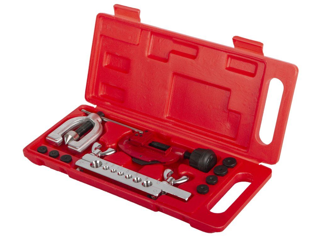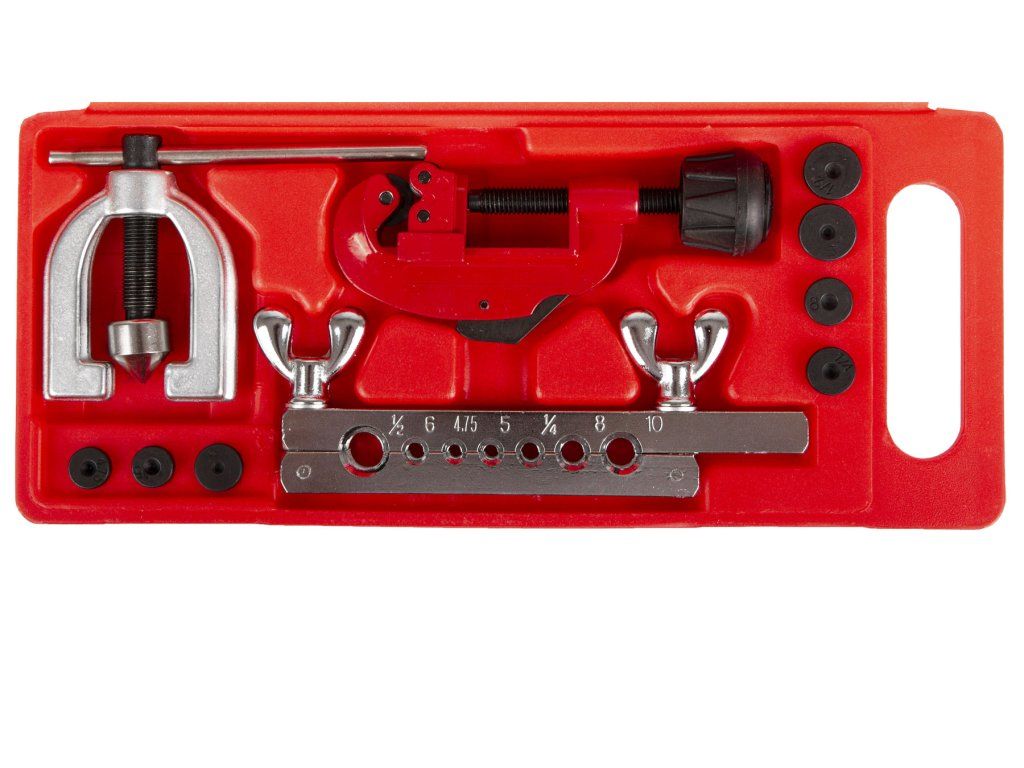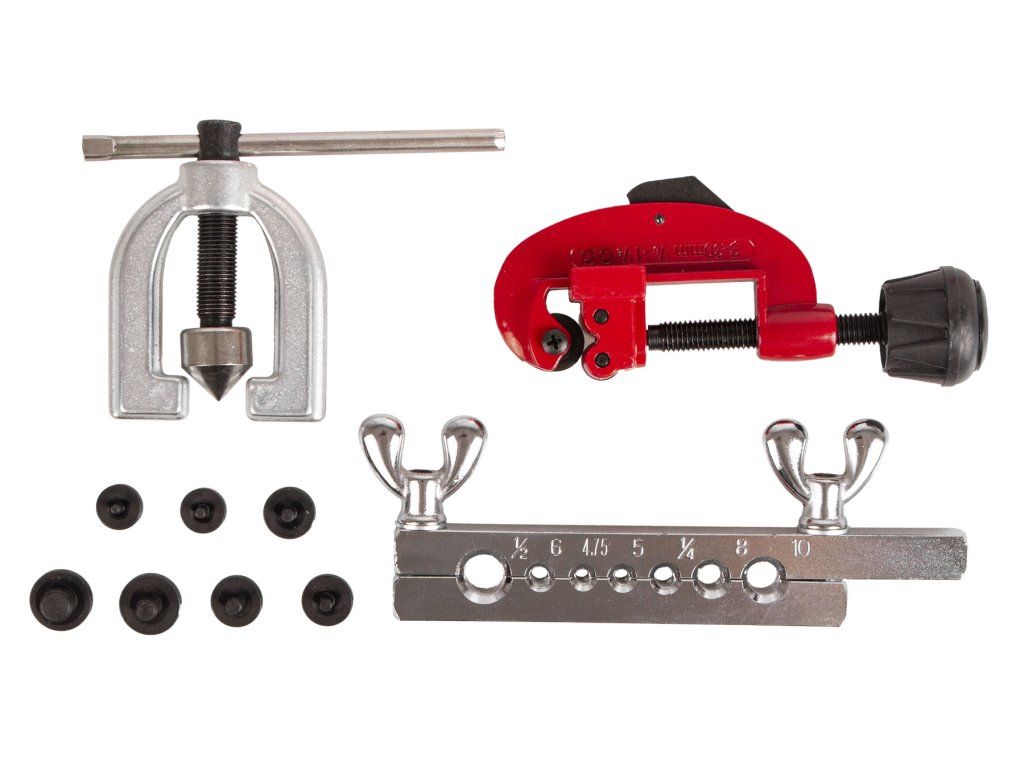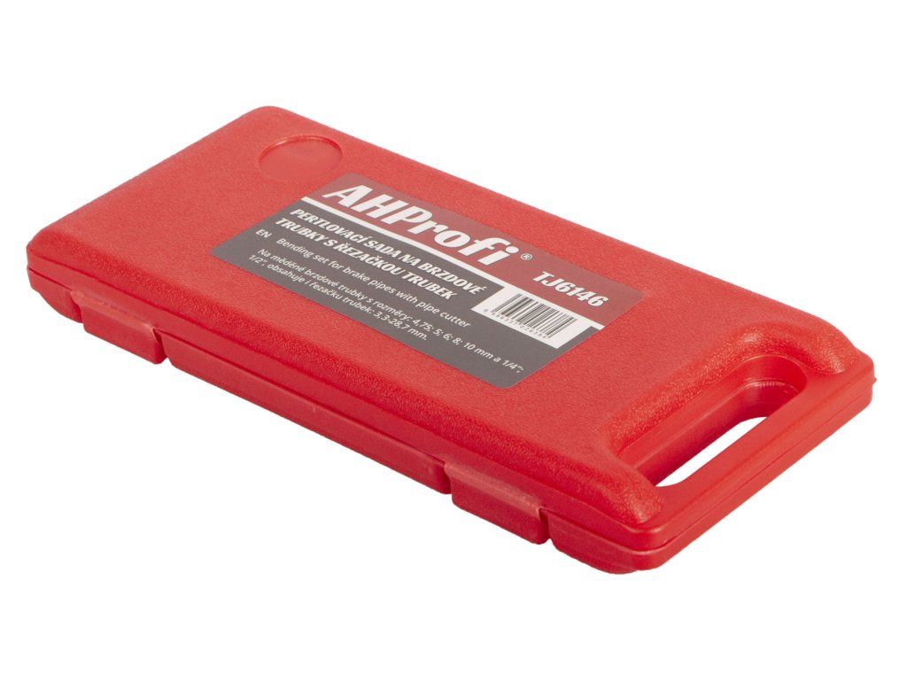 Základní pertlovací sada na měděné brzdové trubky s rozměry: 4,75; 5; 6; 8; 10 mm a 1/4"; 1/2". Souprava je uložena v tvrdém plastovém kufru spolu s řezačkou trubek průměru: 3,3 - 28,7 mm.
