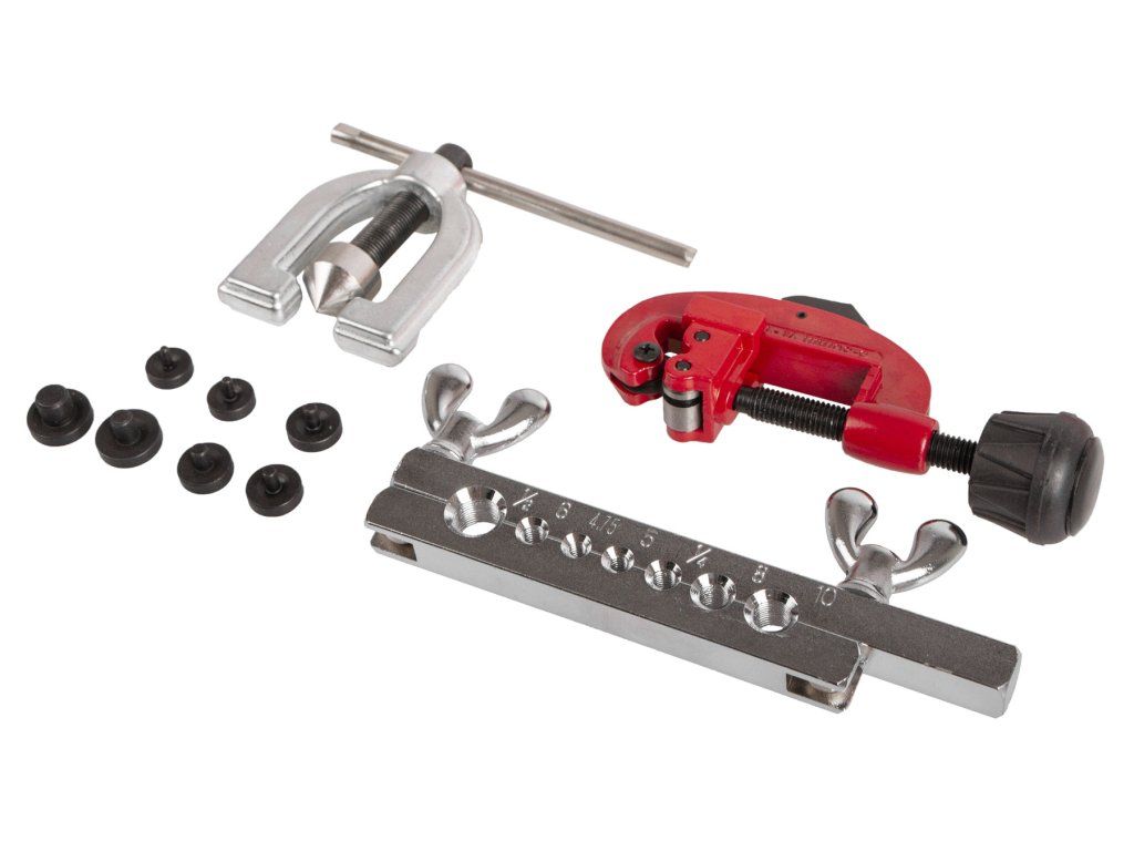 Základní pertlovací souprava na měděné brzdové trubky s rozměry: 4,75; 5; 6; 8; 10 mm a 1/4"; 1/2", obsahuje i řezačku trubek 3,3 - 28,7 mm.