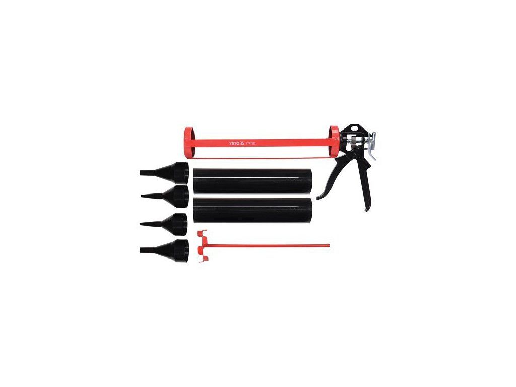 Pryžový píst je vyztužený kovovými destičkami. Sada obsahuje míchadlo pro přípravu hmot a dva hroty pro aplikaci.