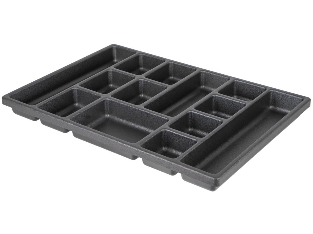 Plastová ABS výplň do dílenského vozíku se 13 přihrádkami, hloubka 45 mm. Rozměr výplně 560 x 390 x 45 mm. Tloušťka stěny 2 mm.