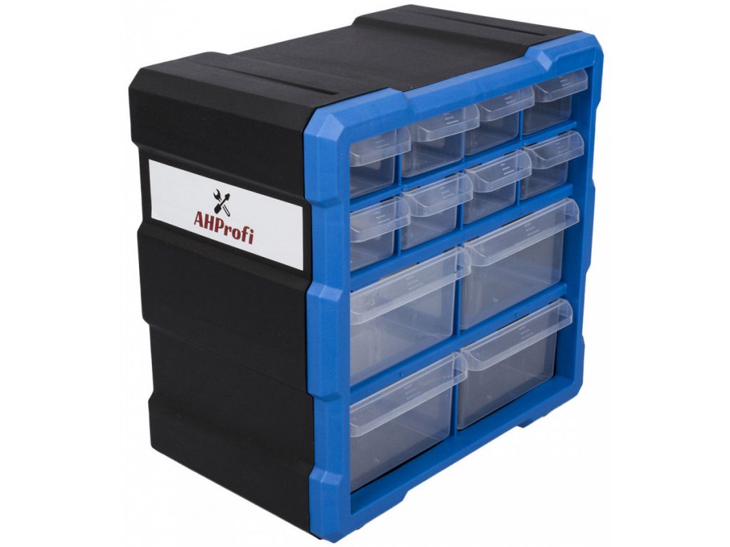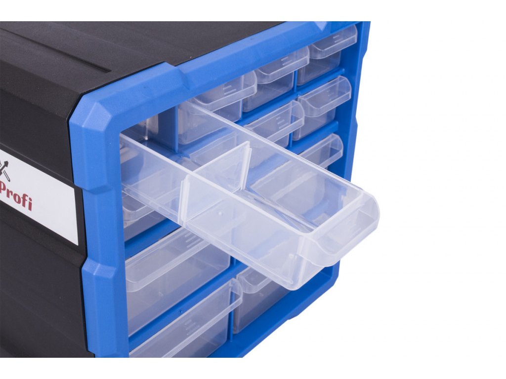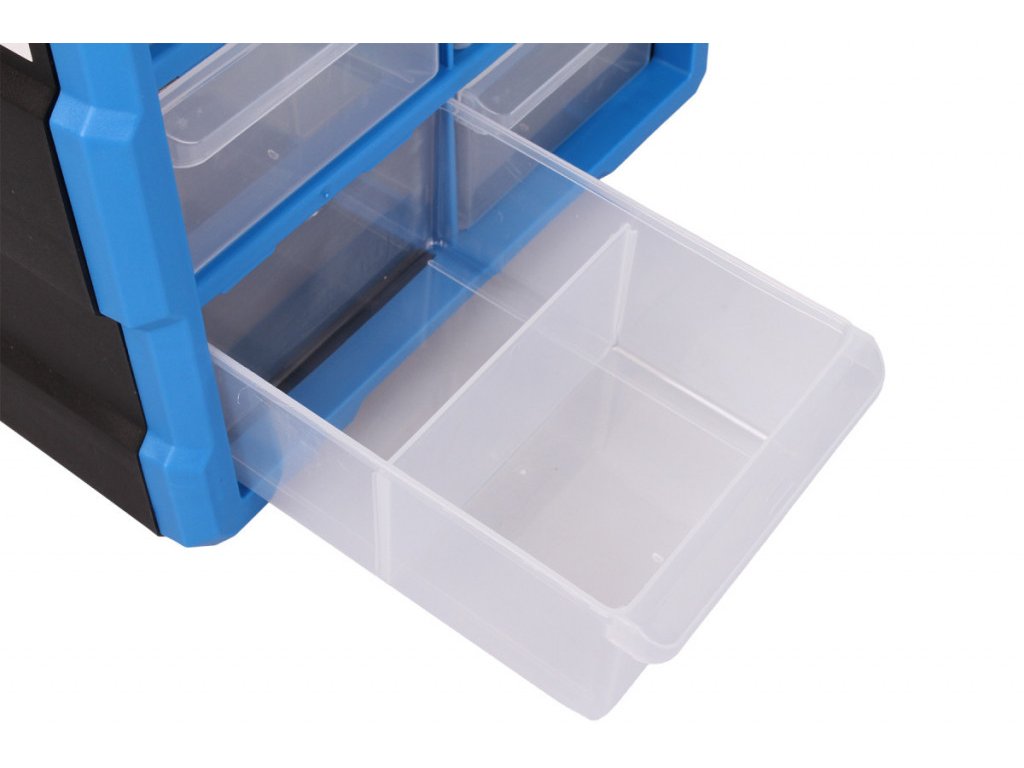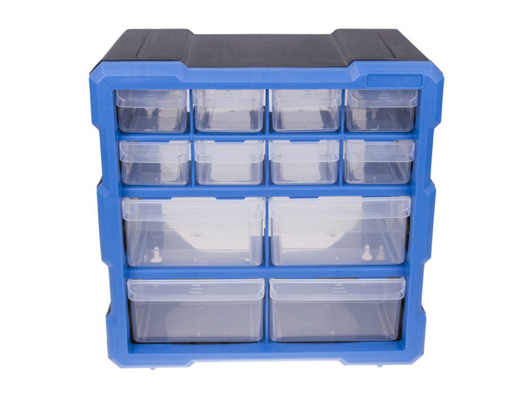 Plastový organizér s 12 zásuvkami lze jednoduše zavěsit na zeď, nebo např. z boku skříně, dílenského vozíku apod. Je možné ho postavit na ponk, nebo pracovní stůl a slouží pro uložení montážního materiálu a drobného dílenského vybavení.