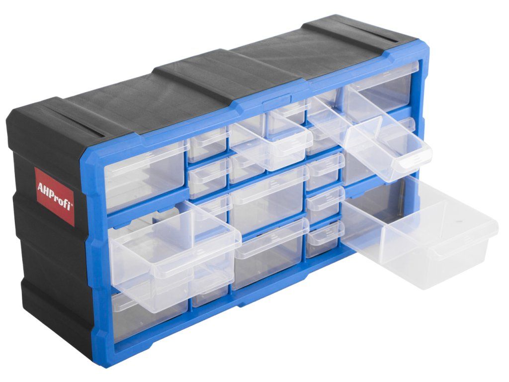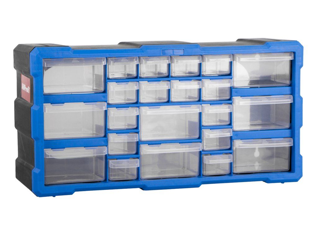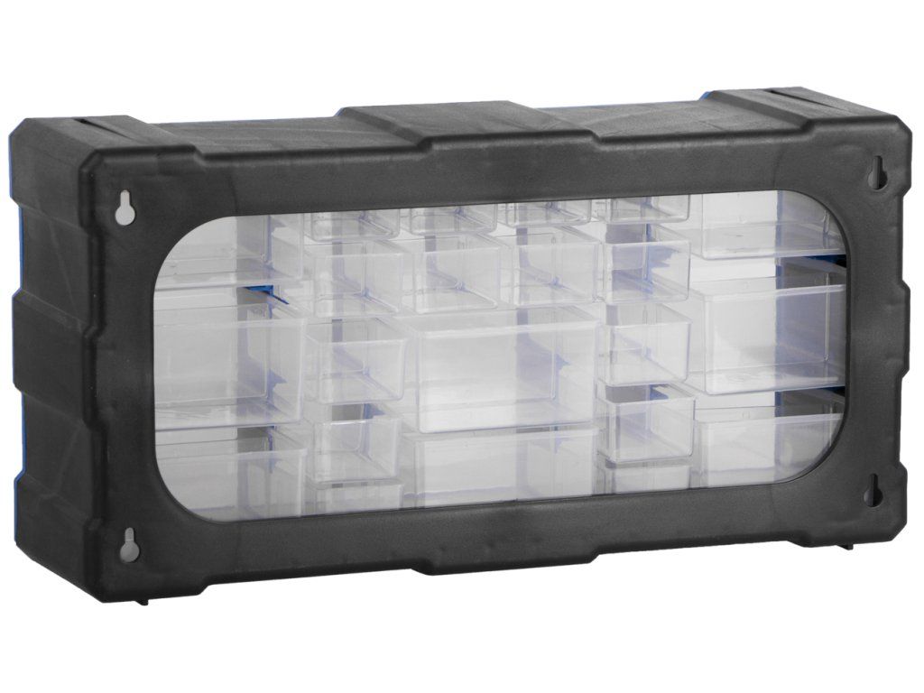 Plastový organizér s 22 zásuvkami lze jednoduše zavěsit na zeď, nebo např. z boku skříně, dílenského vozíku apod. Je možné ho postavit na ponk, nebo pracovní stůl a slouží pro uložení montážního materiálu a drobného dílenského vybavení.
