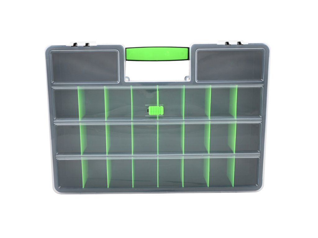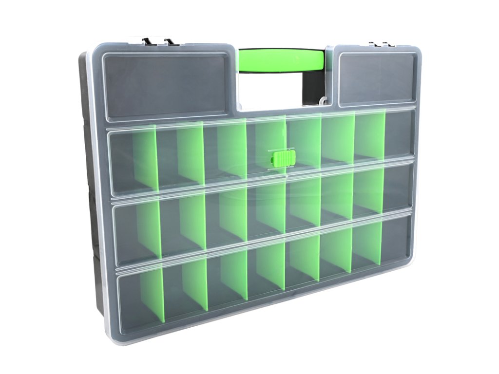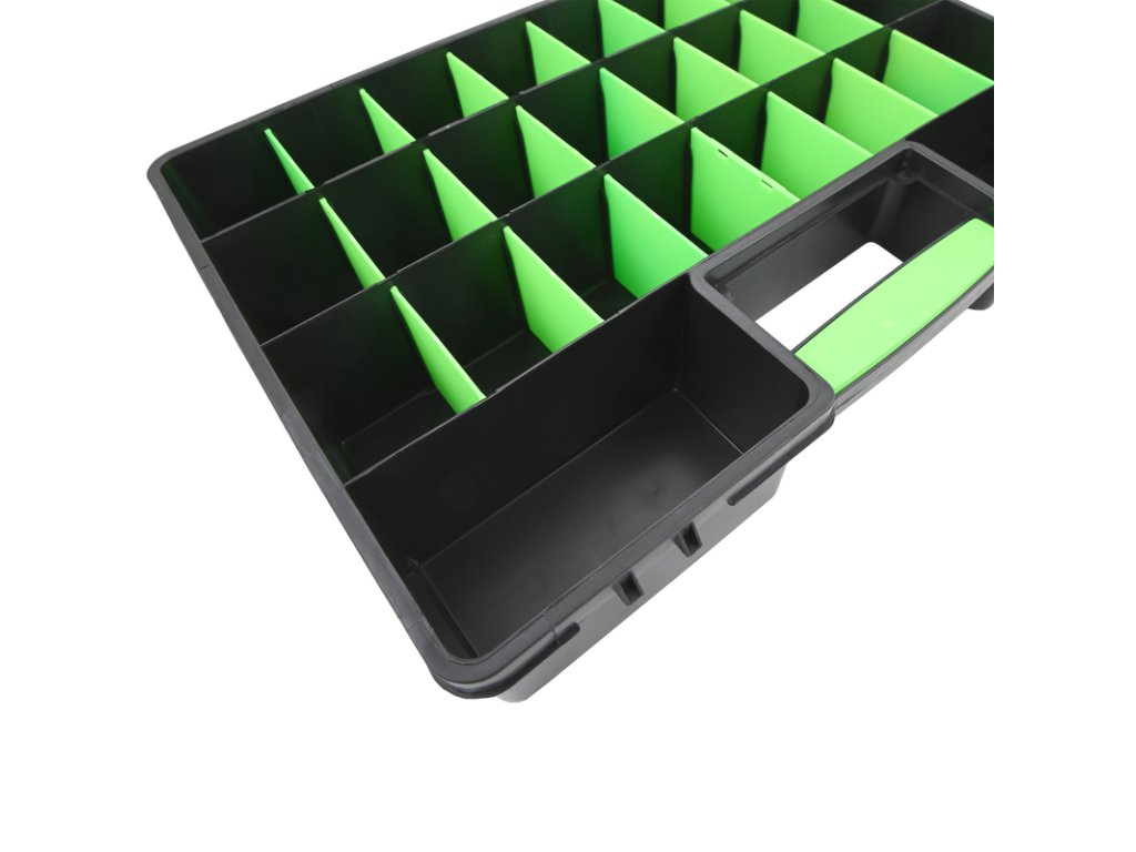 Možnost zvolit velikost přihrádek oceníte zejména pokud potřebujete do organizéru uložit různé velikosti vyvažovacích závaží, či jiného nářadí. Organizér je osazen celkem 26 přihrádkami, z toho je 24 přihrádek možné modifikovat a 2 jsou pevně dané. Organizér může mít minimálně 5 přihrádek (3 podlouhlé a 2 po stranách rukojeti). Toho docílíte vyjmutím všech rozdělovačů.