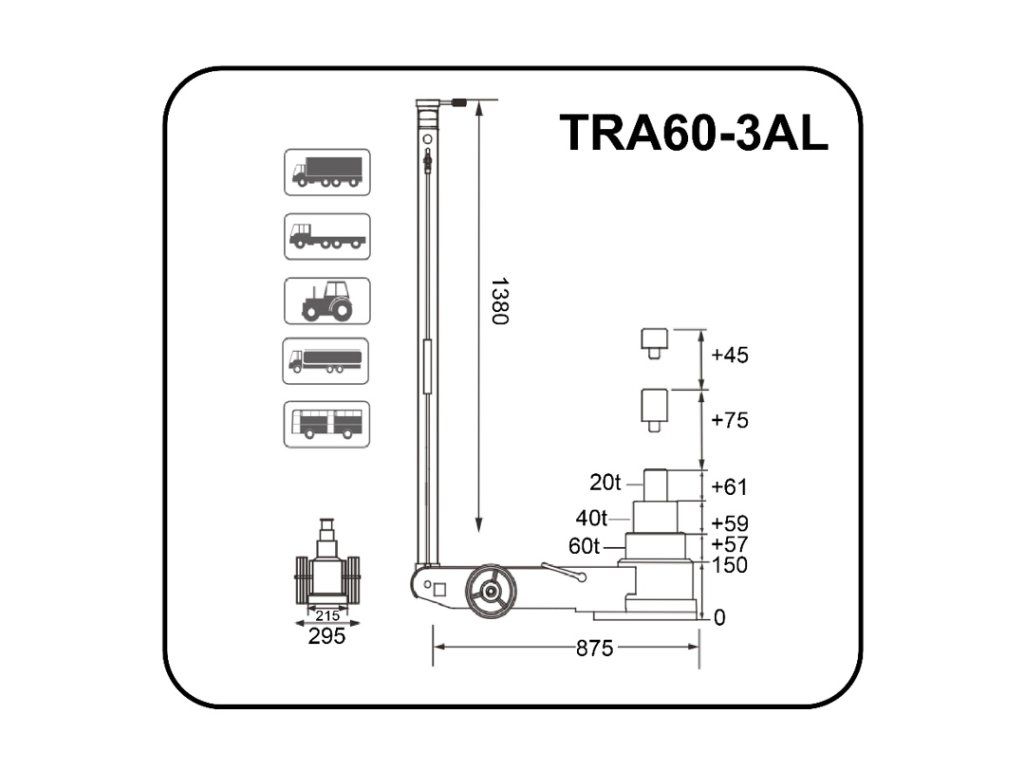 - Zdvih/nosnost: 207 mm (60t), 266 mm (40t), 447 mm (20 tun)