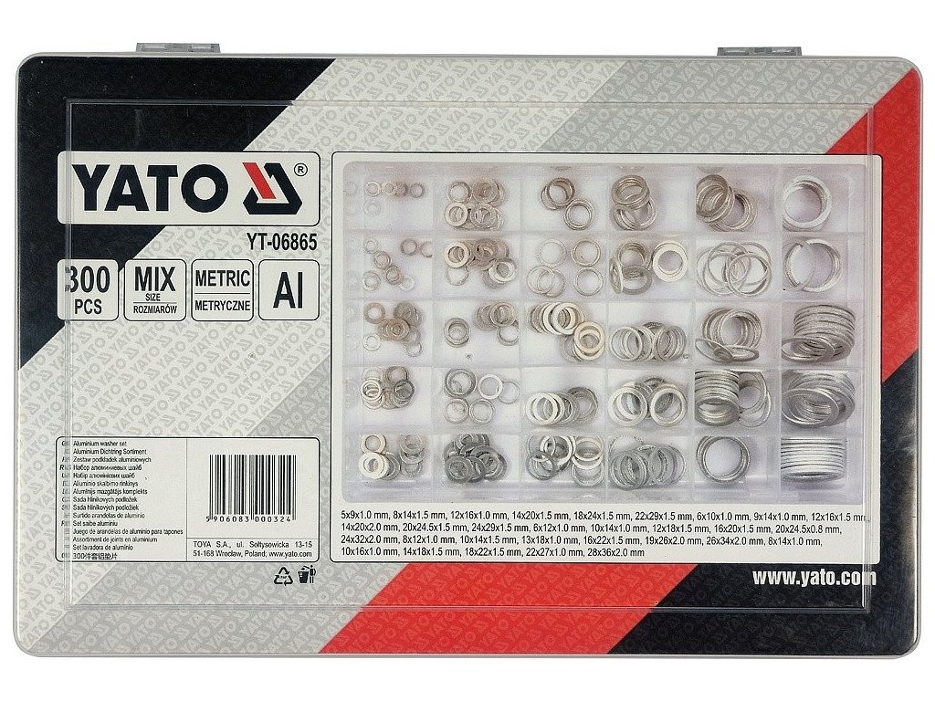 Sada 300 ks kvalitních hliníkových podložek rozměrů od 5 x 9 mm do 28 x 36 mm, dohromady 30 druhů podložek po 10 ks.
