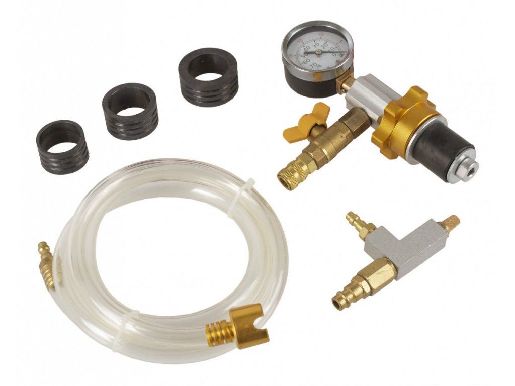Po připojení kuželového adaptéru s manometrem k vyrovnávací nádržce chladící kapaliny připojíte hadici stlačeného vzduchu k přístroji a vytvoříte podtlak v systému.