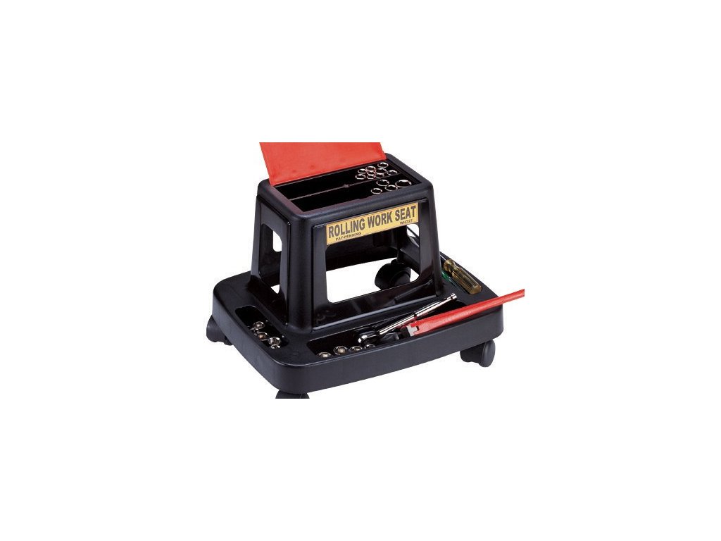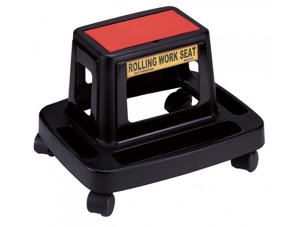 Pojízdná plastová stolička se čtyřmi otočnými kolečky, odkládací prostor pro používané nářadí, úložný prostor uvnitř sedátka.