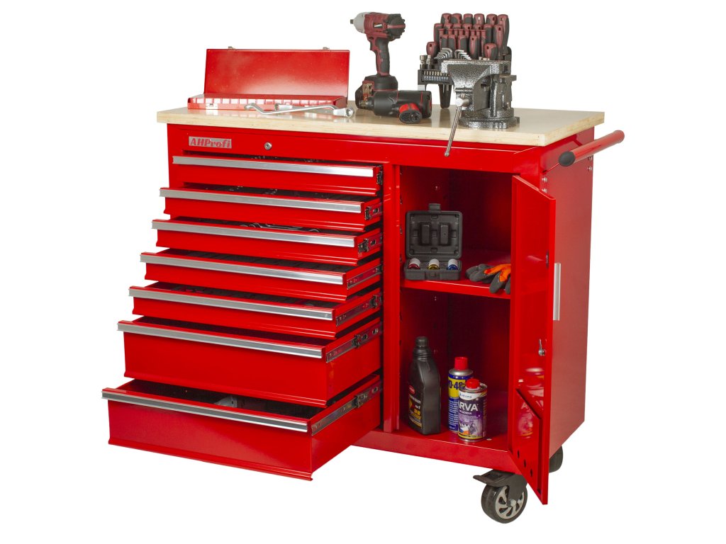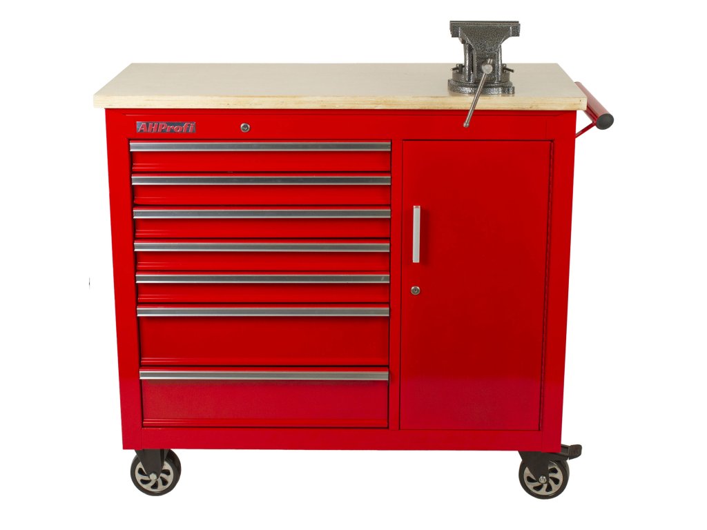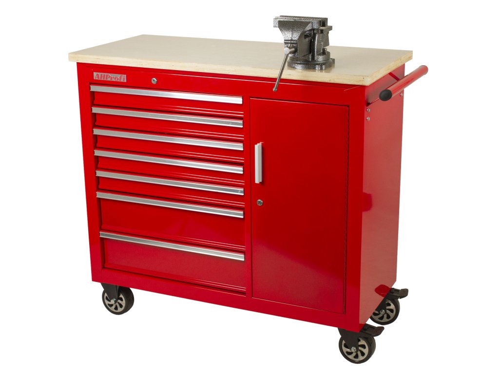 Vozík se skládá ze 7 zásuvek, uzamykatelné skříňky a masivní dřevěné pracovní desky se svěrákem.