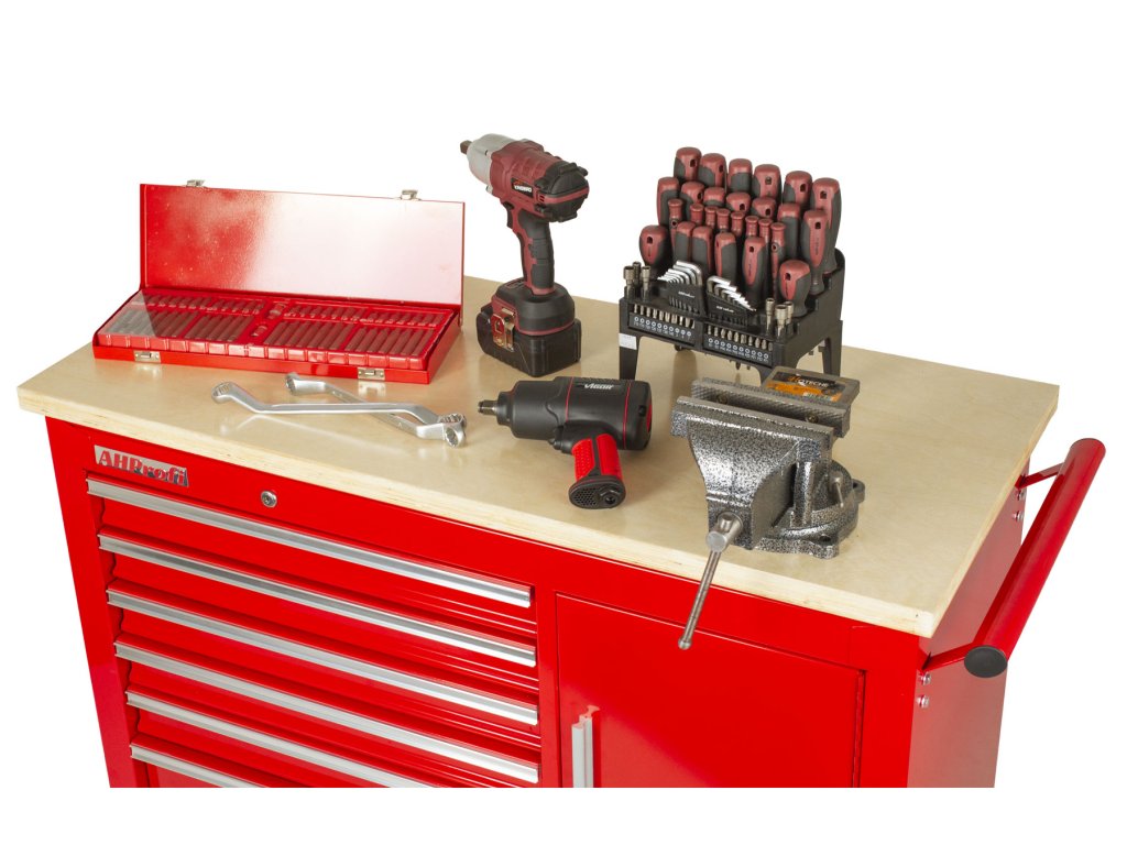 Pojízdný dílenský ponk s nářadím v pěnových výplních a svěrákem - AH4407
