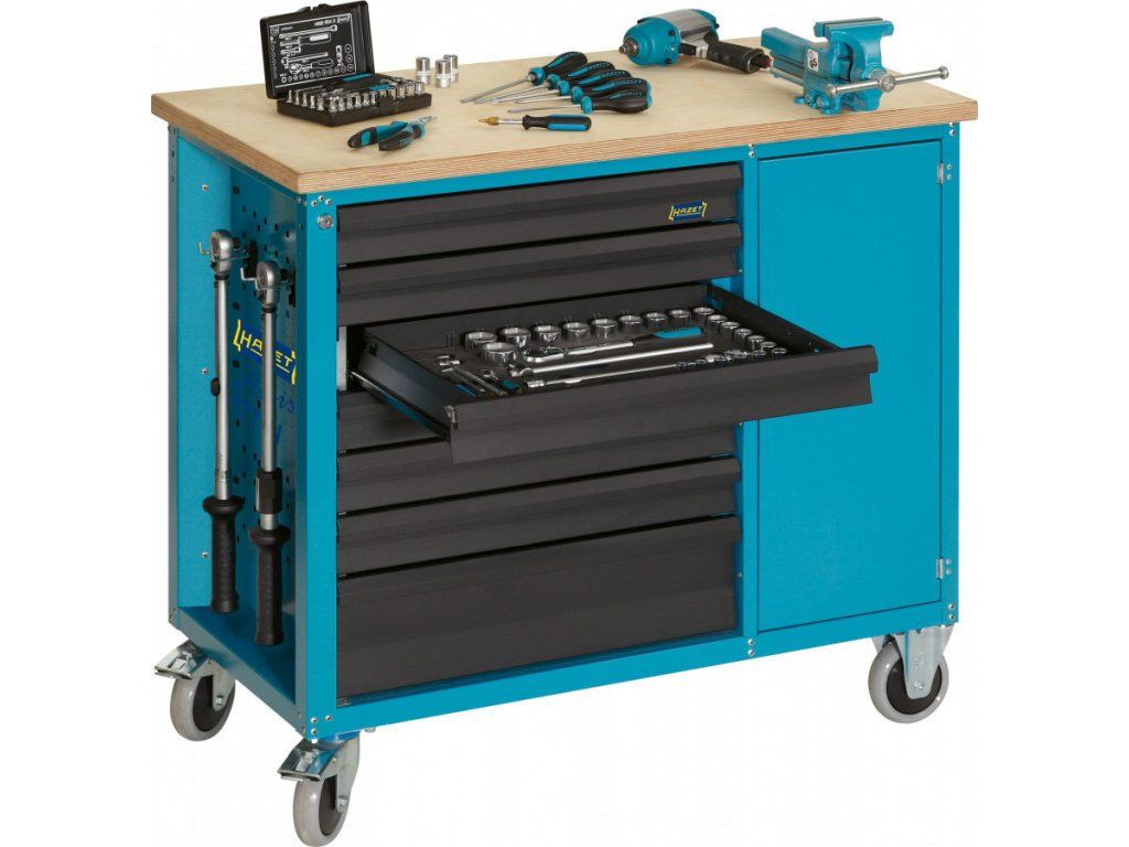 Vysoce kvalitní, pojízdný pracovní stůl HAZET, vyroben z ocelového plechu, dřevěná deska, 7 zásuvek, nosnost až 700 kg.