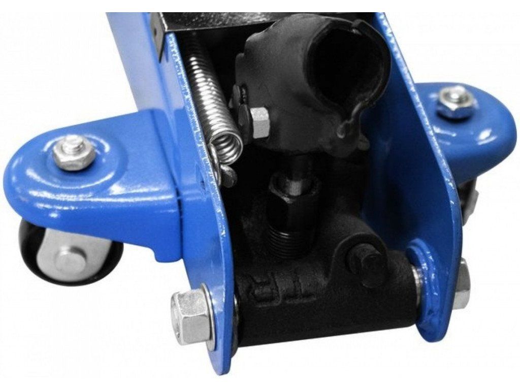 Konstrukce: robustní ocelový rám, zdvihací páka s lícováním pro ovládání ventilu, pojezdová kola (→ 2 pevná/2 otočná), transportní madlo.