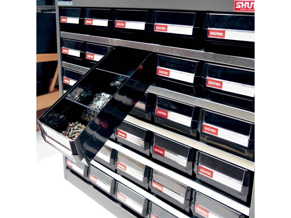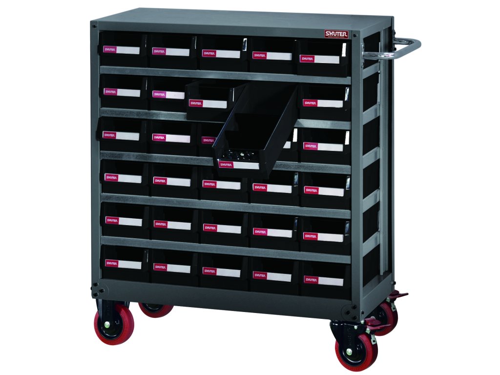 - Pojízdný dílenský kovový organizér pro uložení montážního materiálu a nářadí s 30 zásuvkami.