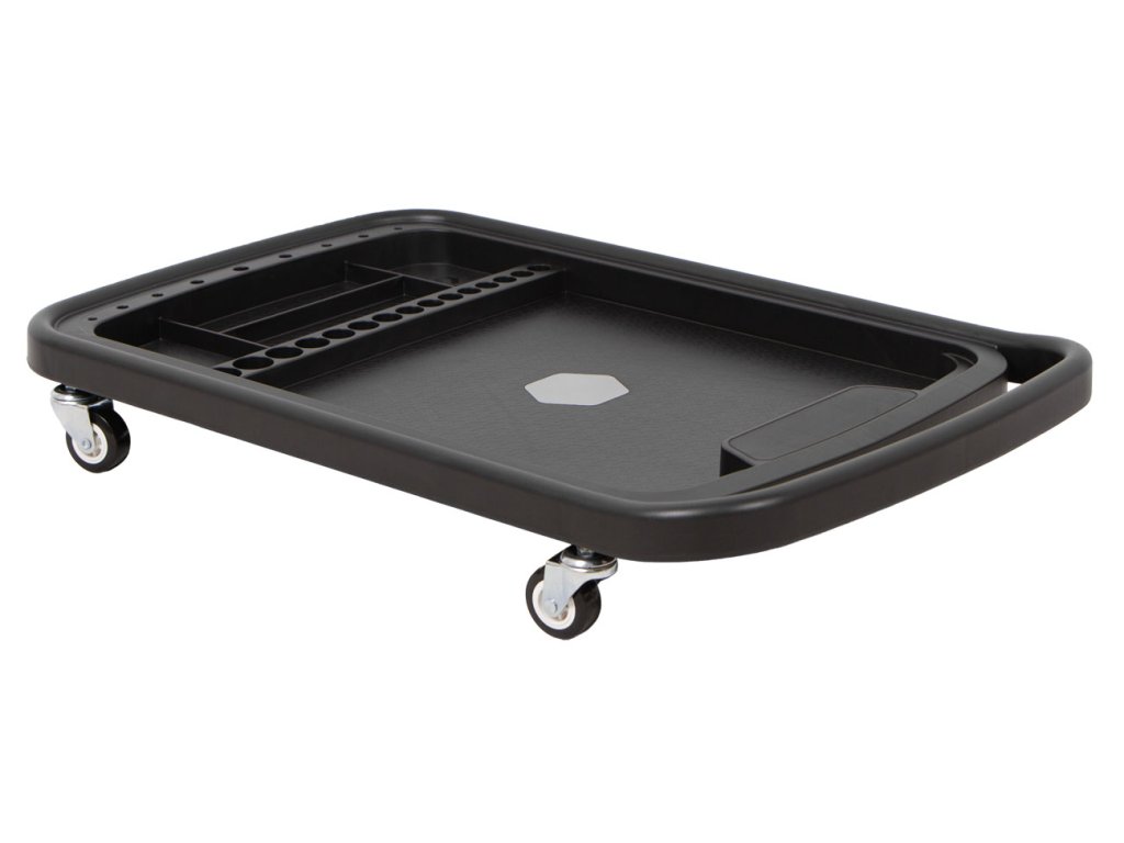 Pojízdný odkládací montážní stolek pro organizaci nářadí a drobných součástek při práci v dílně, garáži i mimo ni.