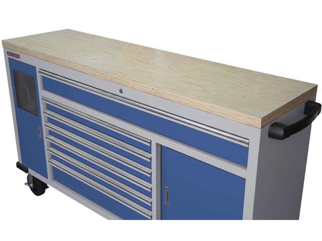 Pojízdný kovový dílenský stůl se 7 šuplíky, skříňkou a odpadkovým košem se bude hodit nejednomu profíkovi nebo kutilovi do jeho dílny.