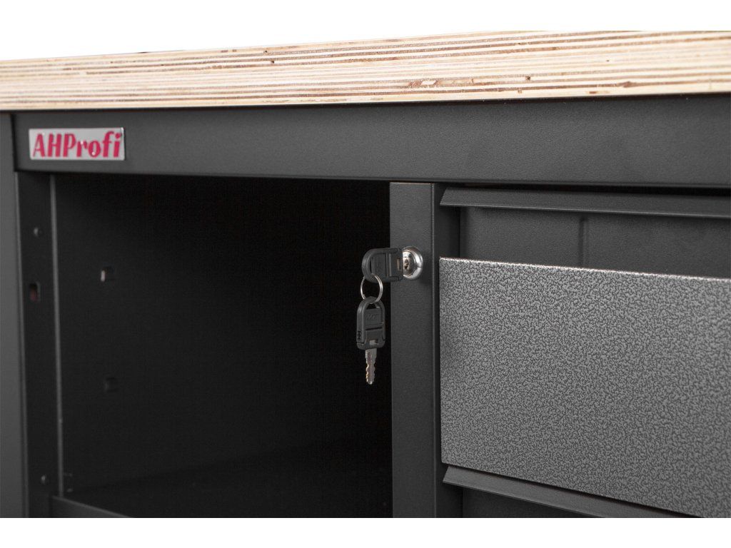 Stůl je vybavený dřevěnou pracovní deskou o rozměrech 1200 x 600 mm, policí a 3 uzamykatelnými šuplíky.