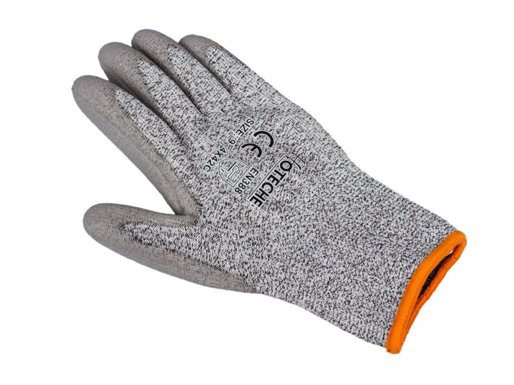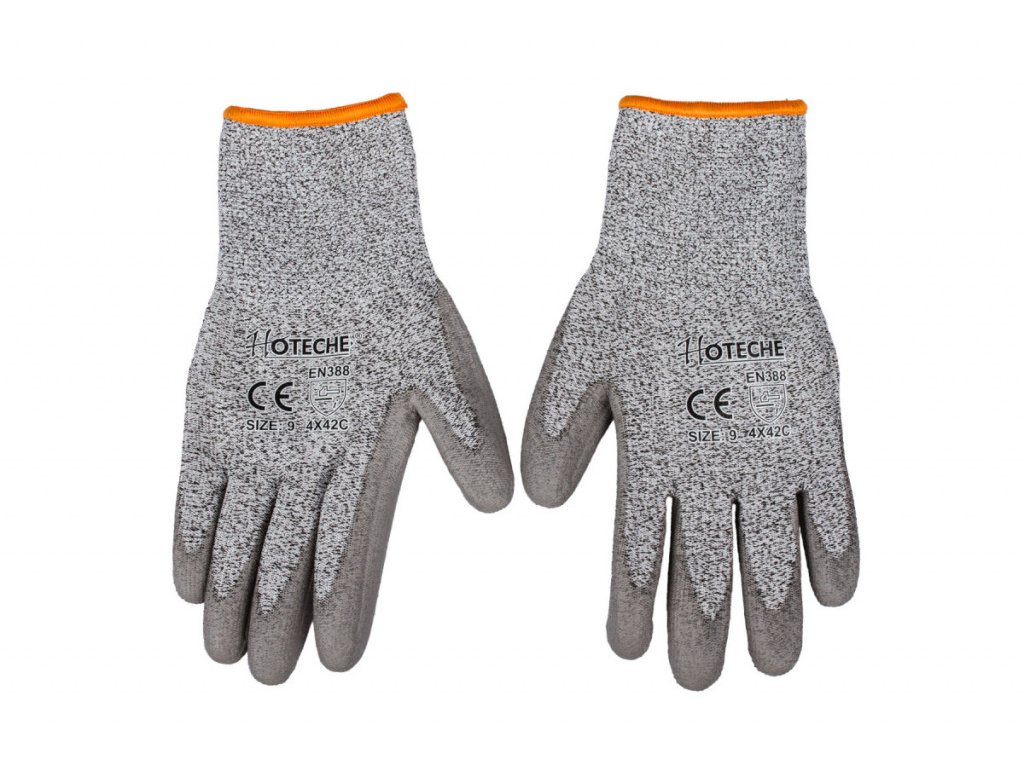 Protipořezové ochranné rukavice značky Hoteche v šedé barvě ve velikosti 9/L.